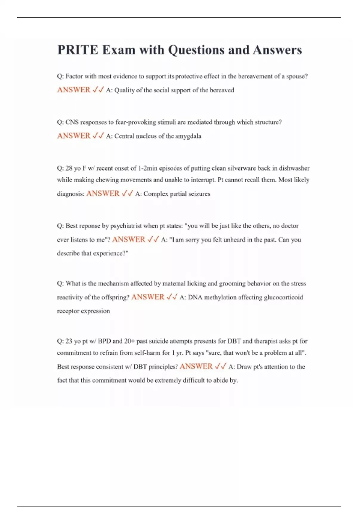 PRITE Exam with Questions and Answers Q: Factor with most evidence to support its protective effect in the bereavement of a spouse? ANSWER A: Quality of the social support of the bereaved Q: CNS responses to fear-provoking stimuli are mediated through which structure? ANSWER A: Central nucleus of the amygdala Q: 28 yo F w/ recent onset of 1-2min episodes of putting clean silverware back in dishwasher while making chewing movements and unable to interrupt. Pt cannot recall them. Most likely diagnosis: ANSWER A: Complex partial seizures Q: Best reponse by psychiatrist when pt states: "you will be just like the others, no doctor ever listens to me"? ANSWER A: "I am sorry you felt unheard in the past. Can you describe that experience?" Q: What is the mechanism affected by maternal licking and grooming behavior on the stress reactivity of the offspring? ANSWER A: DNA methylation affecting glucocorticoid receptor expression Q: 23 yo pt w/ BPD and 20+ past suicide attempts presents for DBT and therapist asks pt for commitment to refrain from self-harm for 1 yr. Pt says "sure, that won't be a problem at all". Best response consistent w/ DBT principles? ANSWER A: Draw pt's attention to the fact that this commitment would be extremely difficult to abide by.