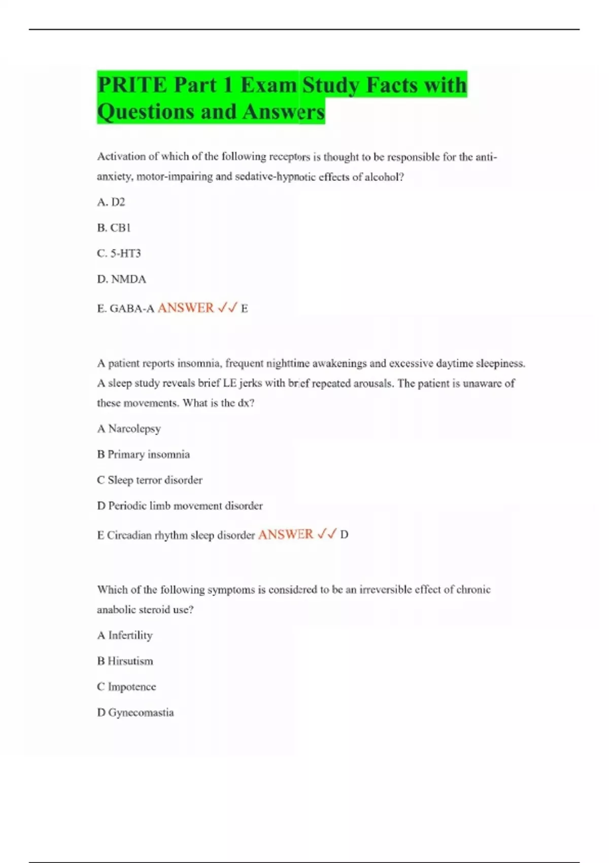 PRITE Part 1 Exam Study Facts with Questions and Answers Activation of which of the following receptors is thought to be responsible for the anti-anxiety, motor-impairing and sedative-hypnotic effects of alcohol? A. D2 B. CB1 C. 5-HT3 D. NMDA E. GABA-A ANSWER E A patient reports insomnia, frequent nighttime awakenings and excessive daytime sleepiness. A sleep study reveals brief LE jerks with brief repeated arousals. The patient is unaware of these movements. What is the dx? A Narcolepsy B Primary insomnia C Sleep terror disorder D Periodic limb movement disorder E Circadian rhythm sleep disorder ANSWER D Which of the following symptoms is considered to be an irreversible effect of chronic anabolic steroid use? A Infertility B Hirsutism C Impotence D Gynecomastia E Testicular atrophy ANSWER B