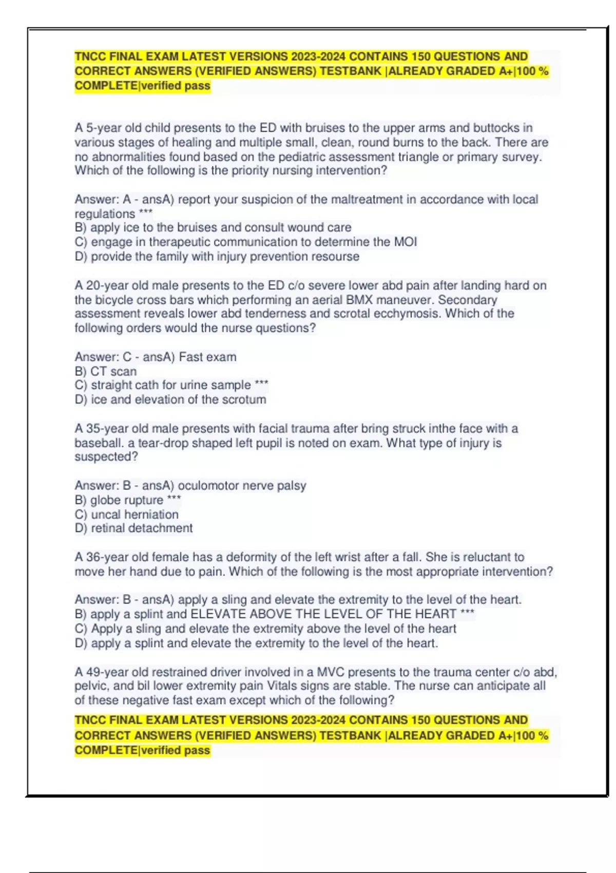 , TNCC FINAL EXAM LATEST VERSIONS 2023-2024 CONTAINS 150 QUESTIONS AND