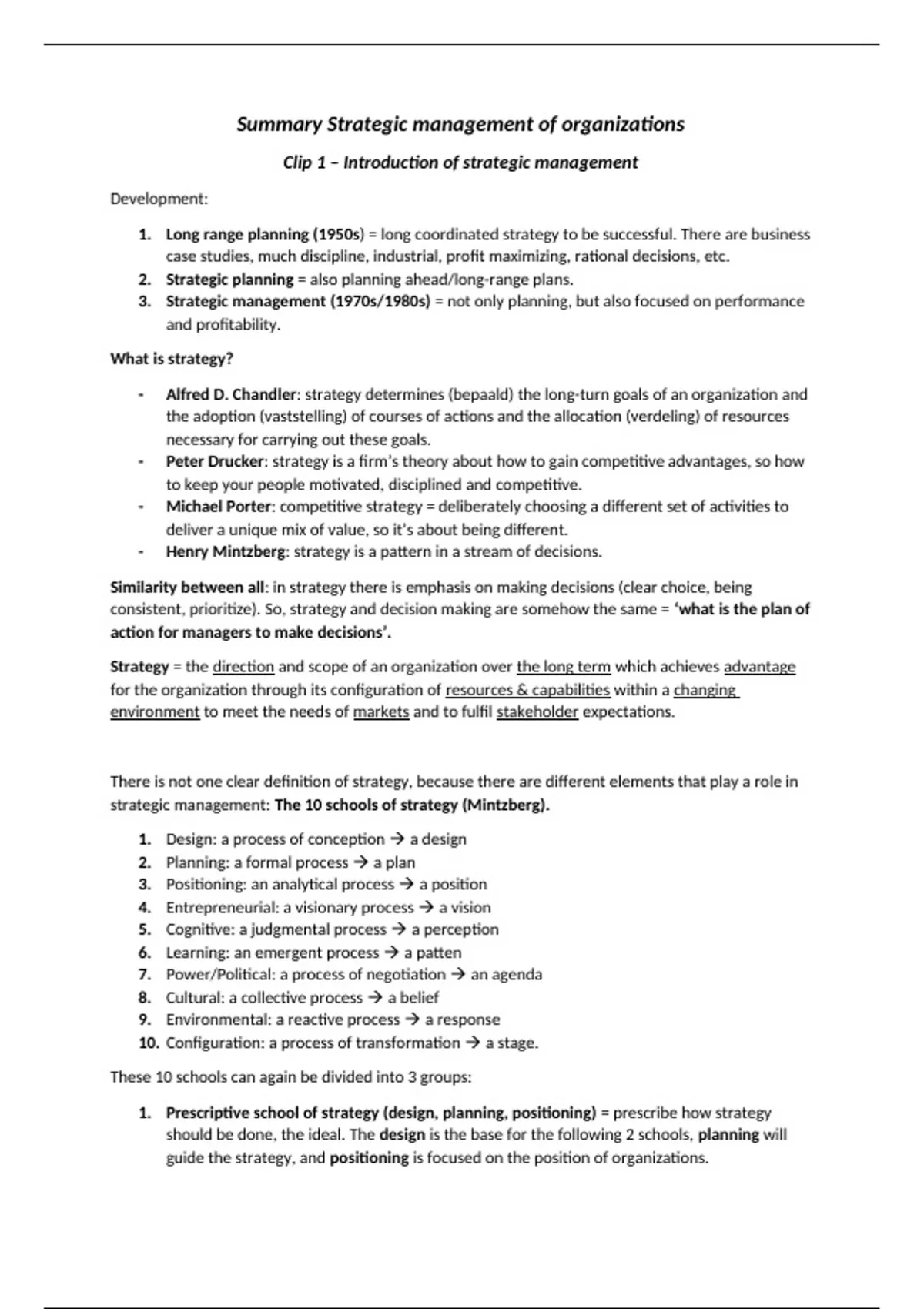 Samenvatting - Strategic Management of Organizations + behandeling van alle cases
