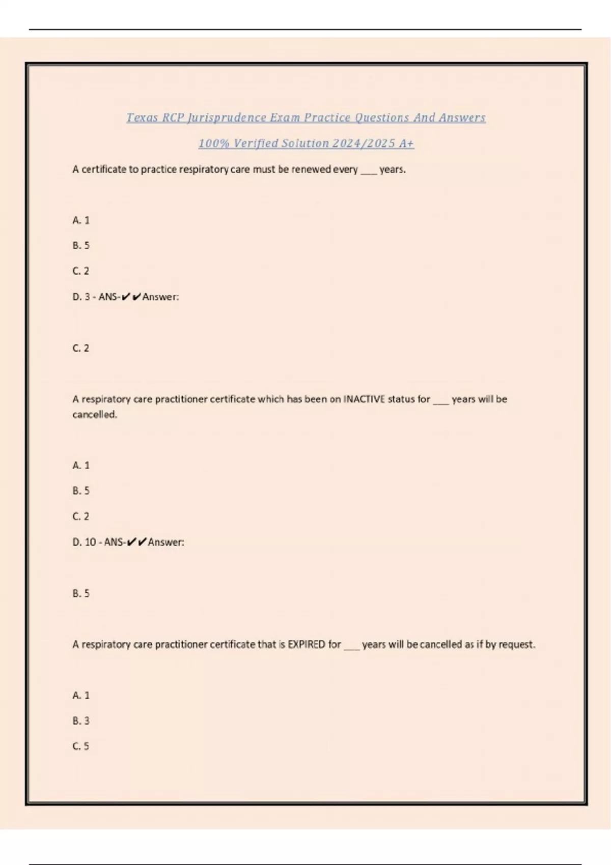 Texas RCP Jurisprudence Exam Practice Questions And Answers 100% Verified Solution 2024/2025 A+ A certificate to practice respiratory care must be renewed every ___ years. A. 1 B. 5 C. 2 D. 3 - ANS-Answer: C. 2 A respiratory care practitioner certificate which has been on INACTIVE status for ___ years will be cancelled. A. 1 B. 5 C. 2 D. 10 - ANS-Answer: B. 5 A respiratory care practitioner certificate that is EXPIRED for ___ years will be cancelled as if by request. A. 1 B. 3 C. 5 D. 10 - ANS-Answer: A. 1 year How many hours of continuing education must you complete for every renewal period? How often is the renewal period? - ANS...