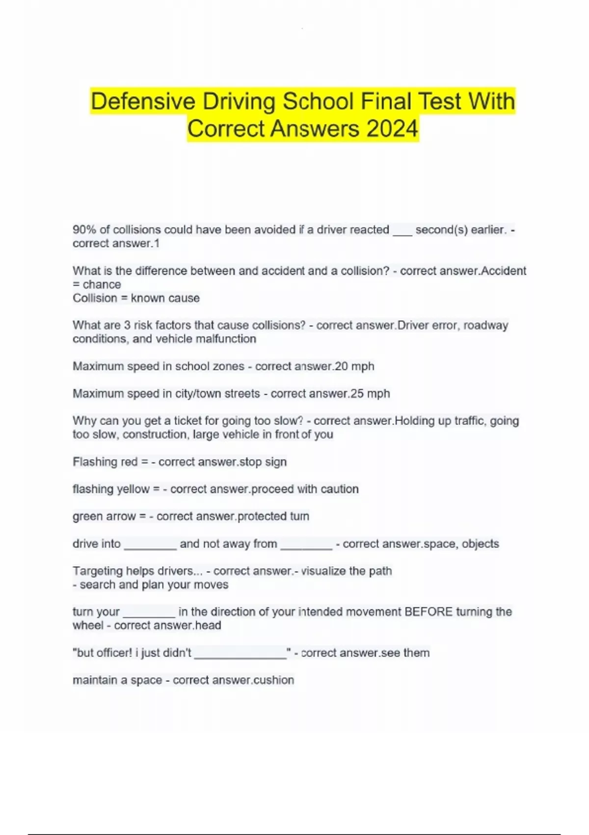 Defensive Driving School Final Test With Correct Answers 2024