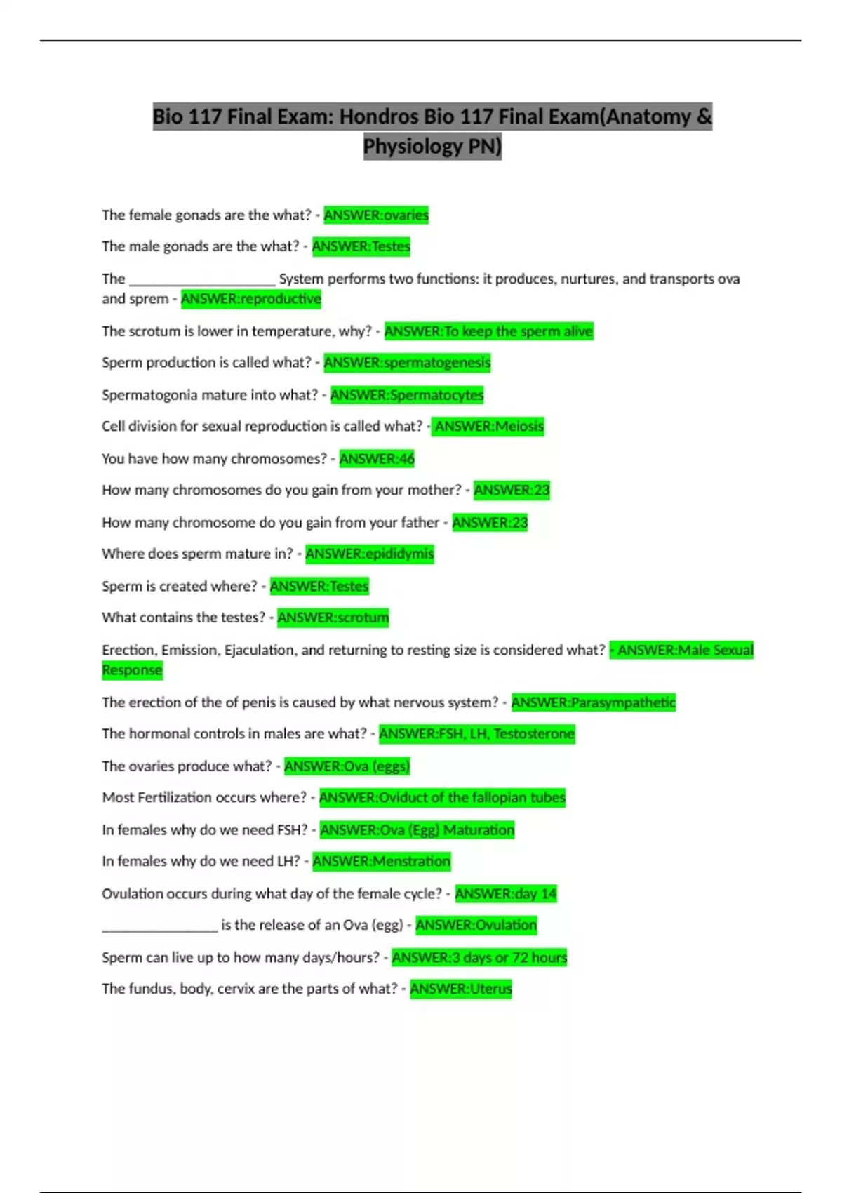 Bio 117 Final Exam: Hondros Bio 117 Final Exam(Anatomy &