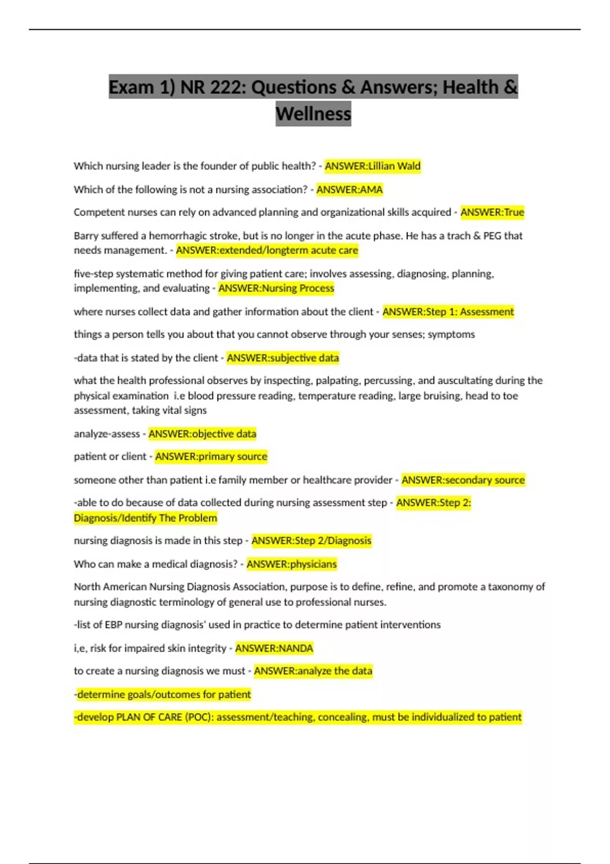 Exam 1) NR 222: Questions & Answers; Health & Wellness