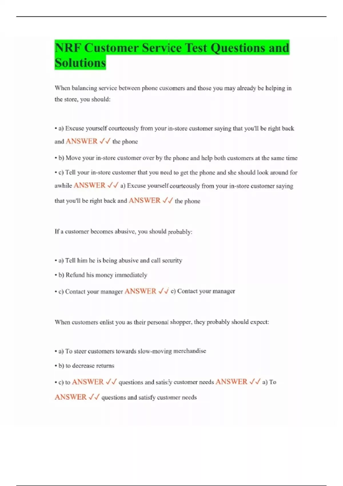 NRF Customer Service Test Questions and Solutions When balancing service between phone customers and those you may already be helping in the store, you should: • a) Excuse yourself courteously from your in-store customer saying that you'll be right back and ANSWER the phone • b) Move your in-store customer over by the phone and help both customers at the same time • c) Tell your in-store customer that you need to get the phone and she should look around for awhile ANSWER a) Excuse yourself courteously from your in-store customer saying that you'll be right back and ANSWER the phone If a customer becomes abusive, you should probably: • a) Tell him he is being abusive and call security • b) Refund his money immediately • c) Contact your manager ANSWER c) Contact your manager When customers enlist you as their personal shopper, they probably should expect: • a) To steer customers towards slow-moving merchandise • b) to decrease returns • c) to ANSWER questions and satisfy customer needs ANSWER a) To ANSWER questions and satisfy customer needs The warranty is an excellent tool for you to use to:
