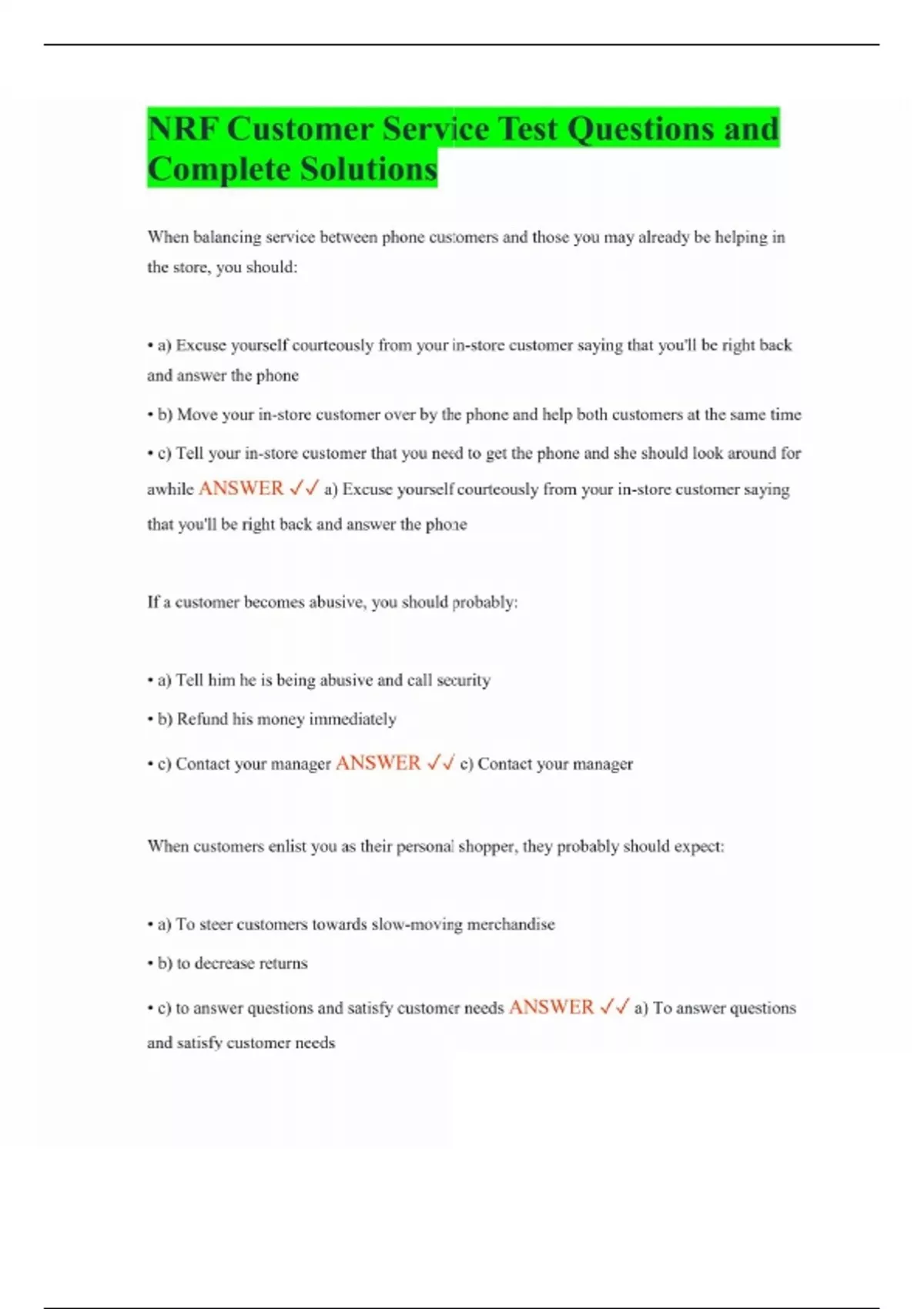 NRF Customer Service Test Questions and Complete Solutions When balancing service between phone customers and those you may already be helping in the store, you should: • a) Excuse yourself courteously from your in-store customer saying that you'll be right back and answer the phone • b) Move your in-store customer over by the phone and help both customers at the same time • c) Tell your in-store customer that you need to get the phone and she should look around for awhile ANSWER a) Excuse yourself courteously from your in-store customer saying that you'll be right back and answer the phone If a customer becomes abusive, you should probably: • a) Tell him he is being abusive and call security • b) Refund his money immediately • c) Contact your manager ANSWER c) Contact your manager When customers enlist you as their personal shopper, they probably should expect: • a) To steer customers towards slow-moving merchandise • b) to decrease returns • c) to answer questions and satisfy customer needs ANSWER a) To answer questions and satisfy customer needs The warranty is an excellent tool for you to use to: