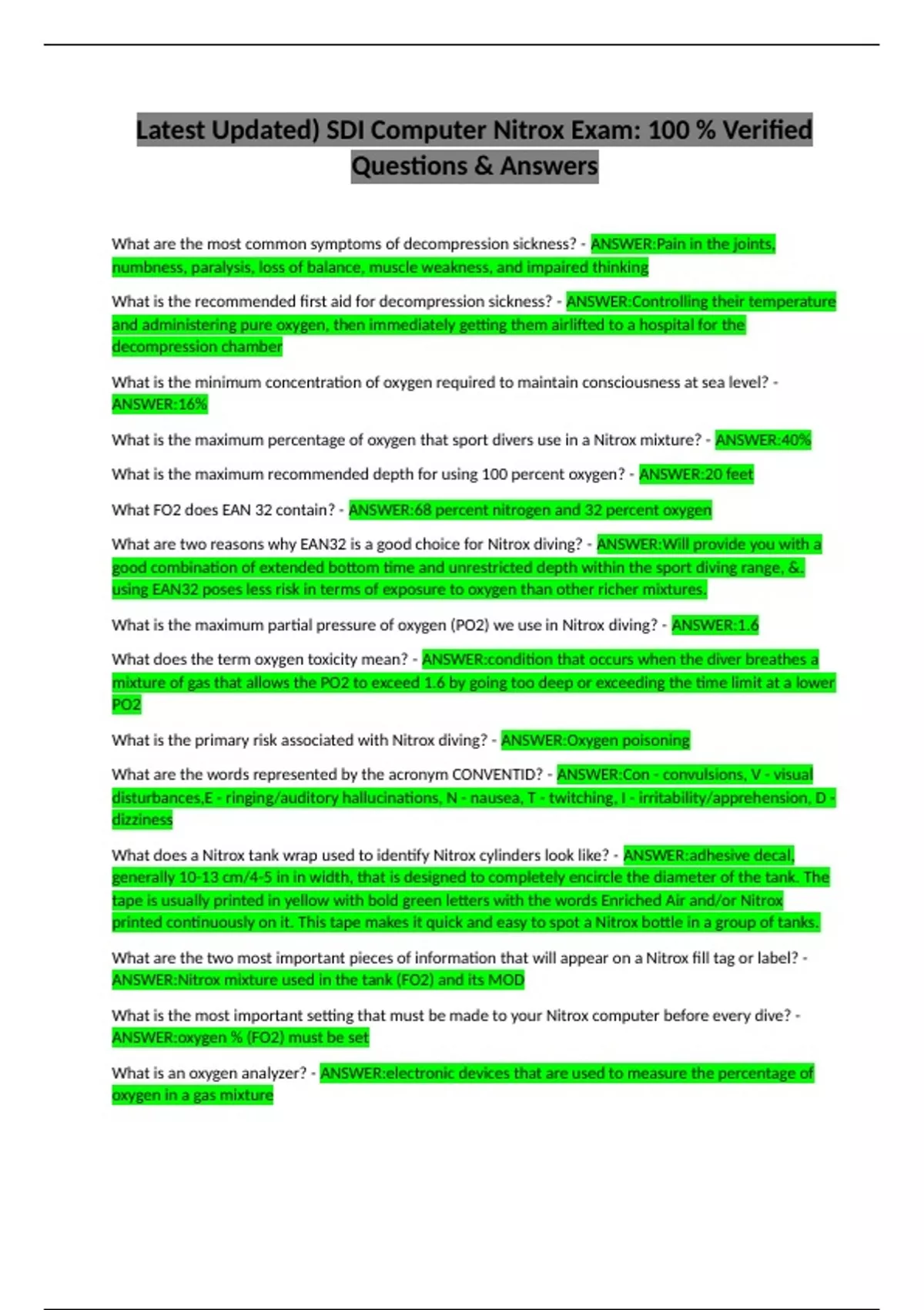 What FO2 does EAN 32 contain? - ANSWER:68 percent nitrogen and 32 percent oxygen