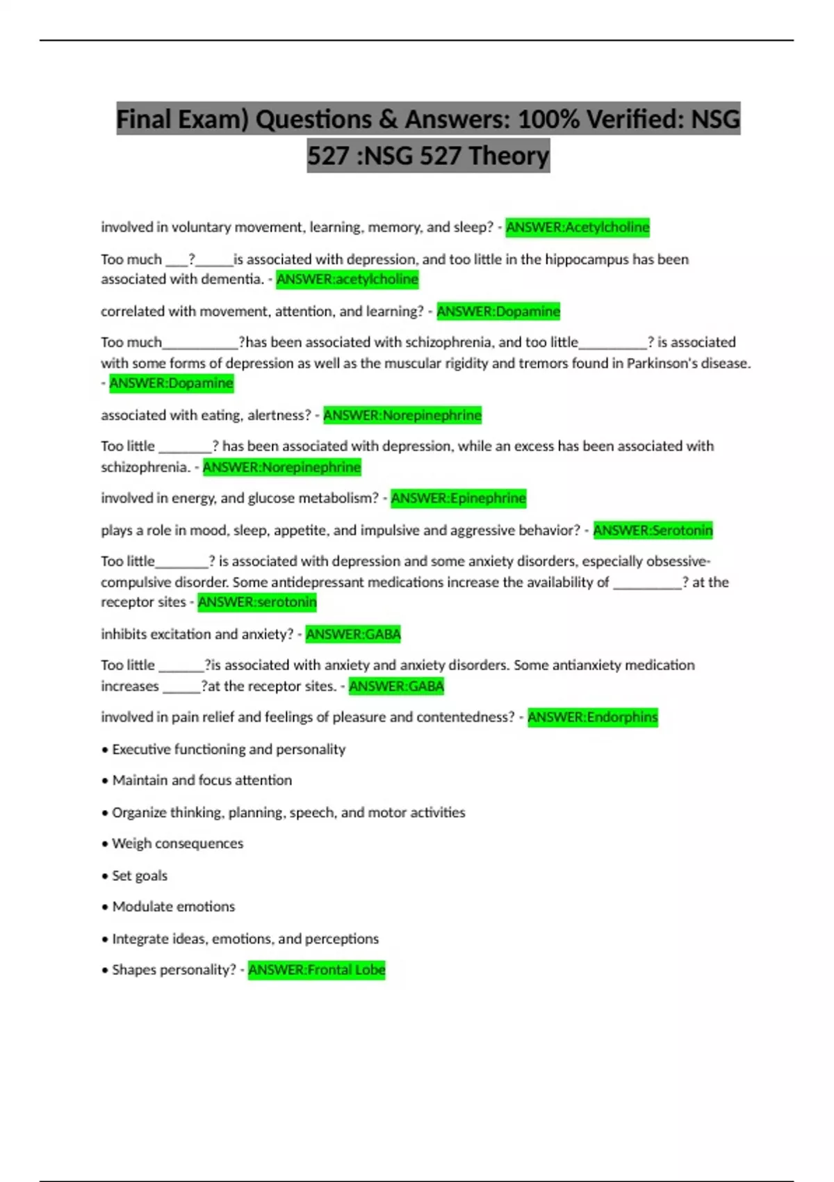 correlated with movement, attention, and learning? - ANSWER:Dopamine