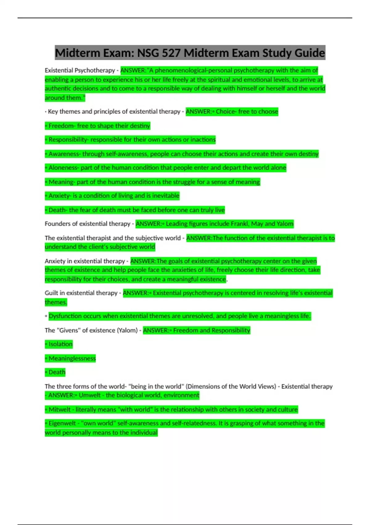 Anxiety in existential therapy - ANSWER:The goals of existential psychotherapy center on the given