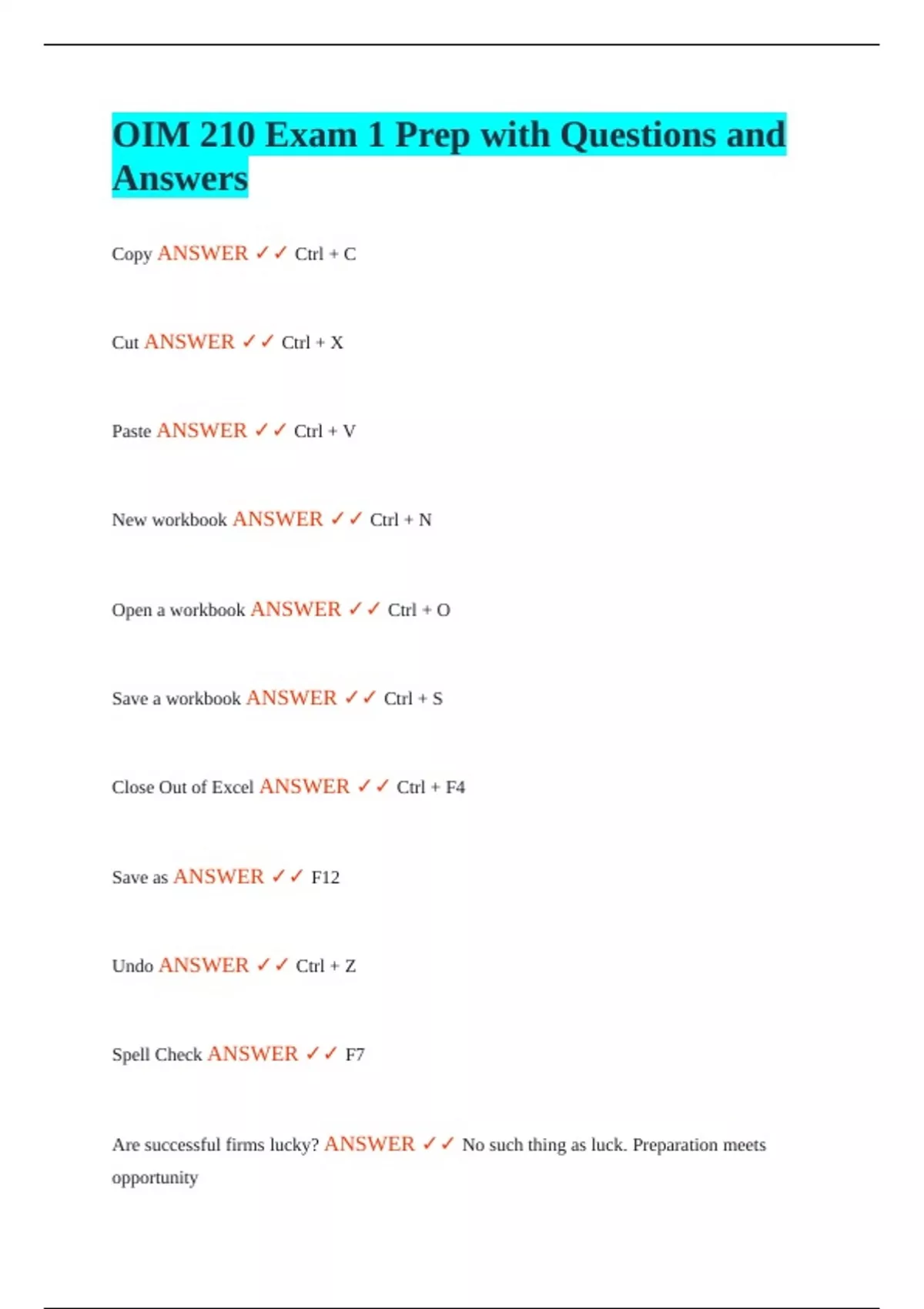 OIM 210 Exam 1 Prep with Questions and Answers Copy ANSWER Ctrl + C Cut ANSWER Ctrl + X Paste ANSWER Ctrl + V New workbook ANSWER Ctrl + N Open a workbook ANSWER Ctrl + O Save a workbook ANSWER Ctrl + S Close Out of Excel ANSWER Ctrl + F4 Save as ANSWER F12 Undo ANSWER Ctrl + Z Spell Check ANSWER F7