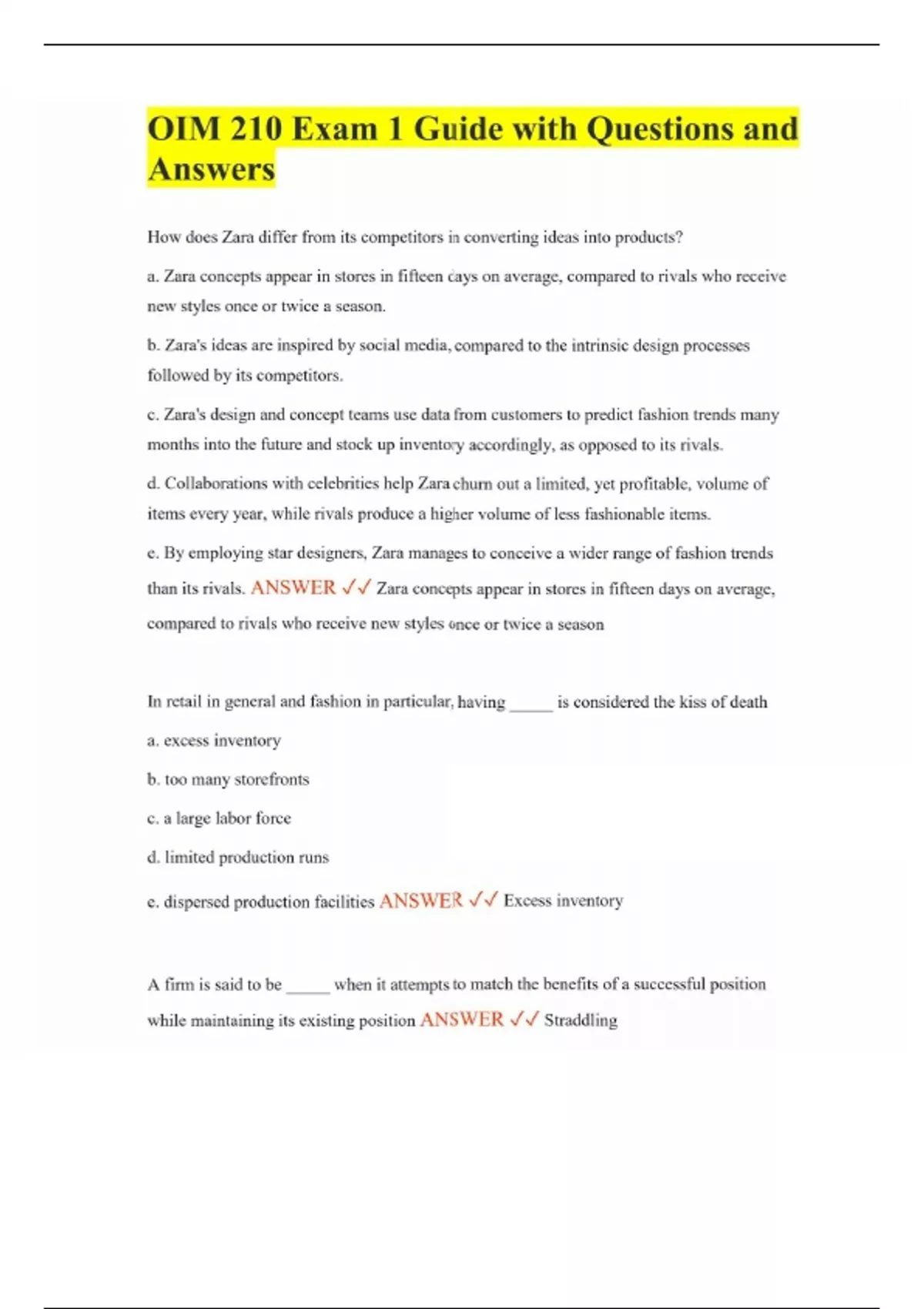 OIM 210 Exam 1 Guide with Questions and Answers How does Zara differ from its competitors in converting ideas into products? a. Zara concepts appear in stores in fifteen days on average, compared to rivals who receive new styles once or twice a season. b. Zara's ideas are inspired by social media, compared to the intrinsic design processes followed by its competitors. c. Zara's design and concept teams use data from customers to predict fashion trends many months into the future and stock up inventory accordingly, as opposed to its rivals. d. Collaborations with celebrities help Zara churn out a limited, yet profitable, volume of items every year, while rivals produce a higher volume of less fashionable items. e. By employing star designers, Zara manages to conceive a wider range of fashion trends than its rivals. ANSWER Zara concepts appear in stores in fifteen days on average, compared to rivals who receive new styles once or twice a season In retail in general and fashion in particular, having _____ is considered the kiss of death a. excess inventory b. too many storefronts c. a large labor force d. limited production runs e. dispersed production facilities ANSWER Excess inventory A firm is said to be _____ when it attempts to match the benefits of a successful position while maintaining its existing position ANSWER Straddling