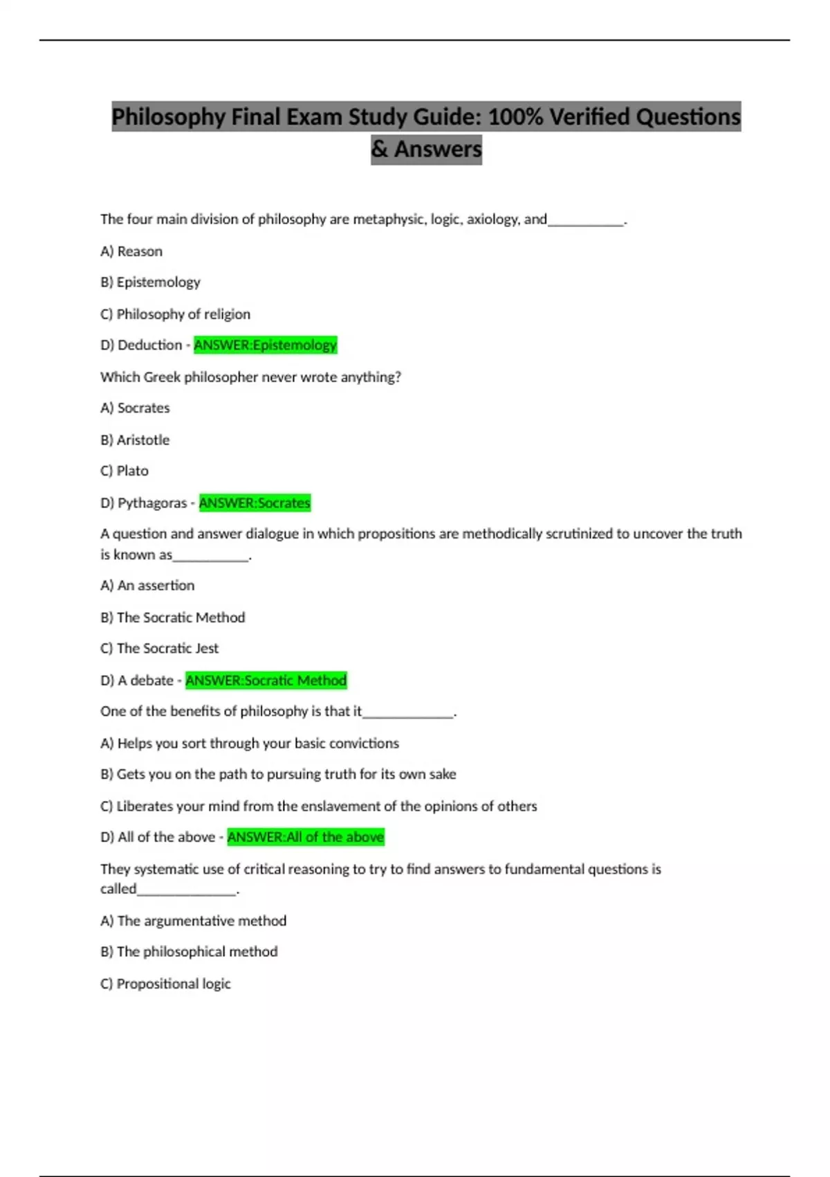 Philosophy Final Exam Study Guide: 100% Verified Questions & Answers