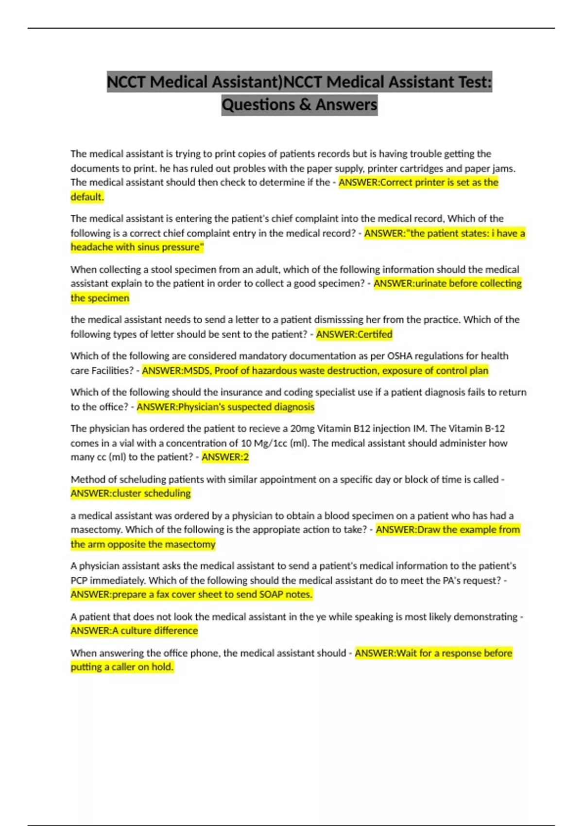 NCCT Medical Assistant)NCCT Medical Assistant Test: Questions & Answers