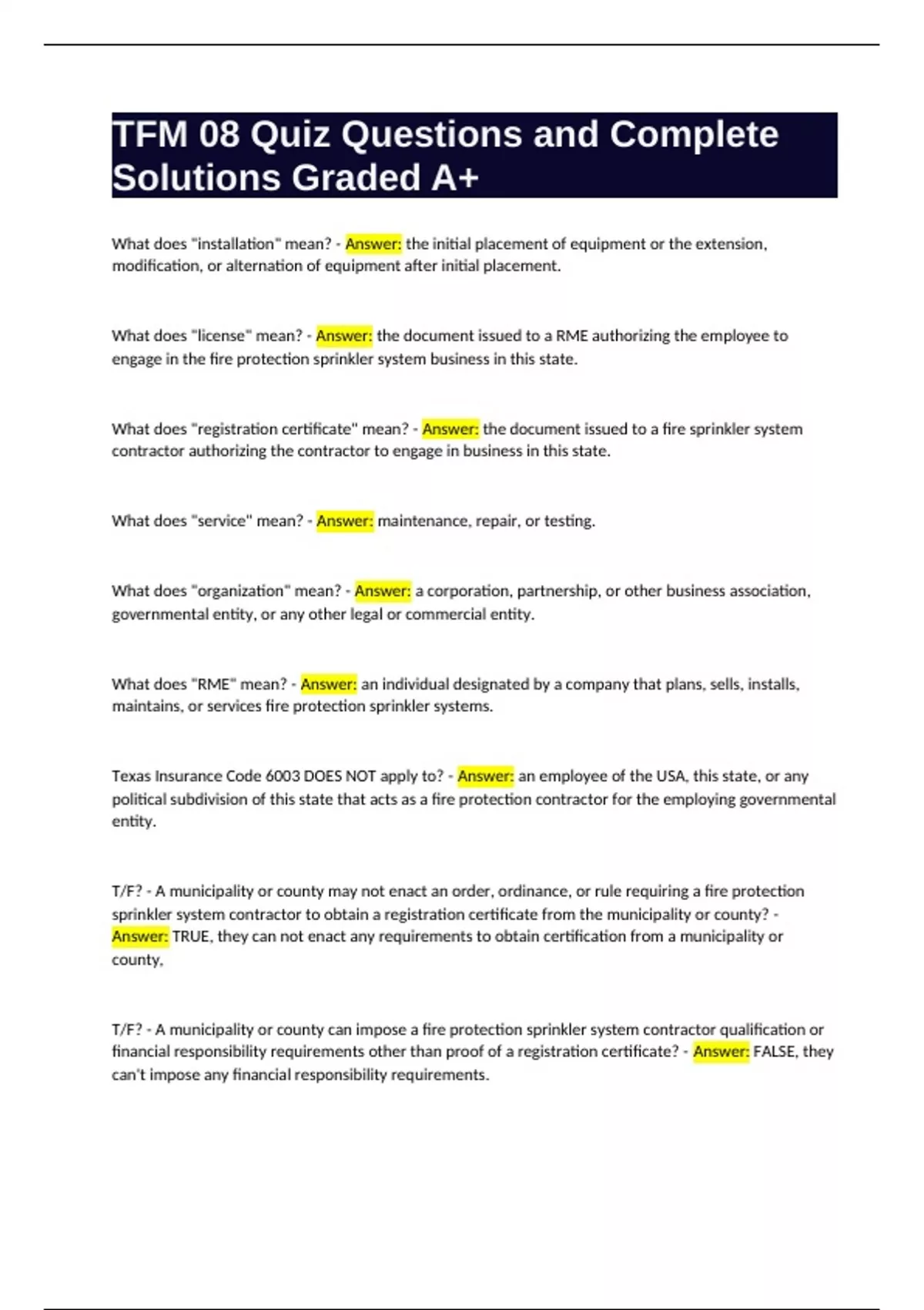 What does "registration certificate" mean? - Answer: the document issued to a fire sprinkler system