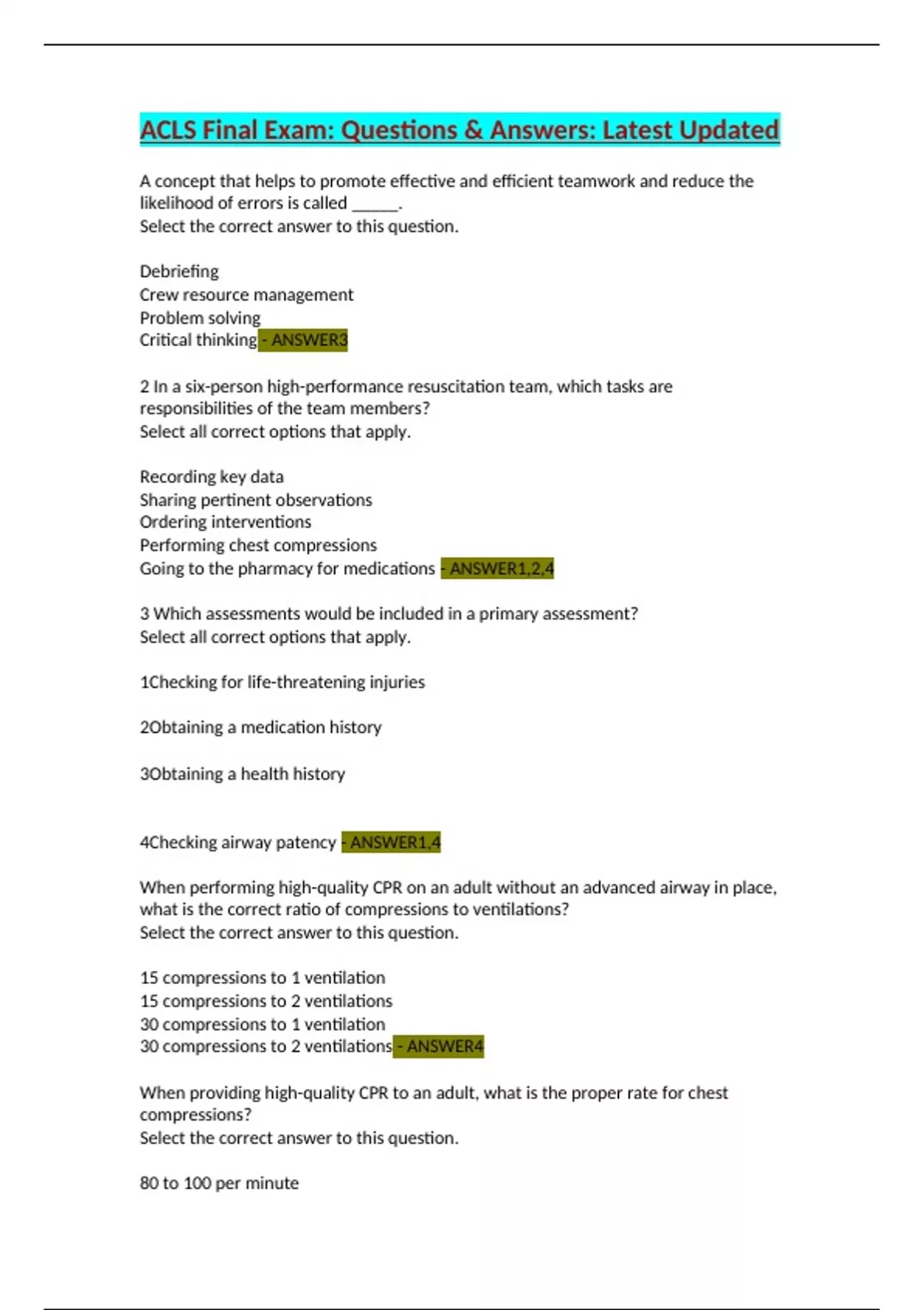 ACLS Final Exam: Questions & Answers: Latest Updated