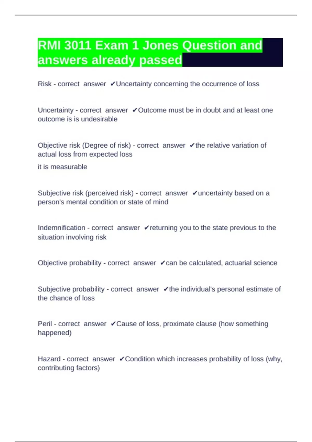 Risk - correct answer ✔Uncertainty concerning the occurrence of loss