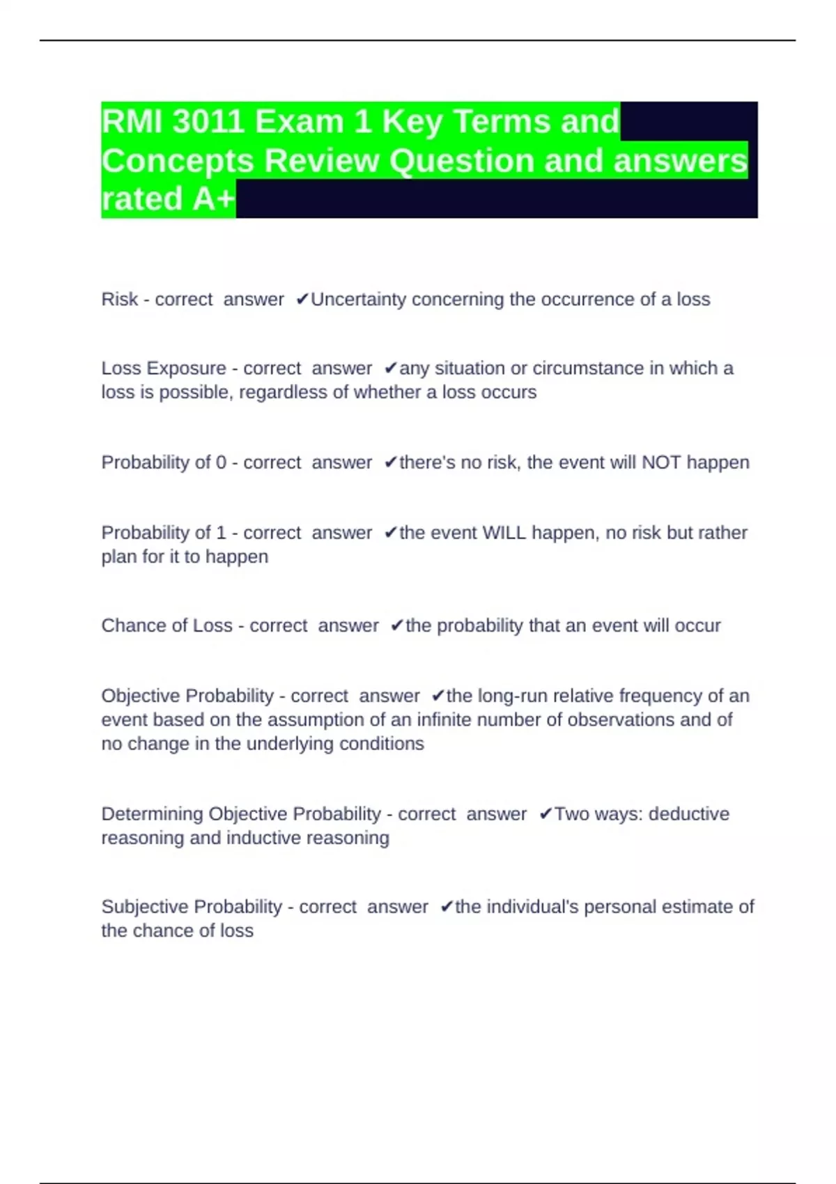 RMI 3011 Exam 1 Key Terms and Concepts Review RMI 3011 Florida State University -Question and answers rated A+ Risk - correct answer Uncertainty concerning the occurrence of a loss Loss Exposure - correct answer any situation or circumstance in which a loss is possible, regardless of whether a loss occurs Probability of 0 - correct answer there's no risk, the event will NOT happen Probability of 1 - correct answer the event WILL happen, no risk but rather plan for it to happen Chance of Loss - correct answer the probability that an event will occur Objective Probability - correct answer the long-run relative frequency of an event based on the assumption of an infinite number of observations and of no change in the underlying conditions Determining Objective Probability - correct answer Two ways: deductive reasoning and inductive reasoning Subjective Probability - correct answer the individual's personal estimate of the chance of loss Pure Risk - correct answer a situation in which there are only the possibilities of: no change or loss (neutral or adverse)