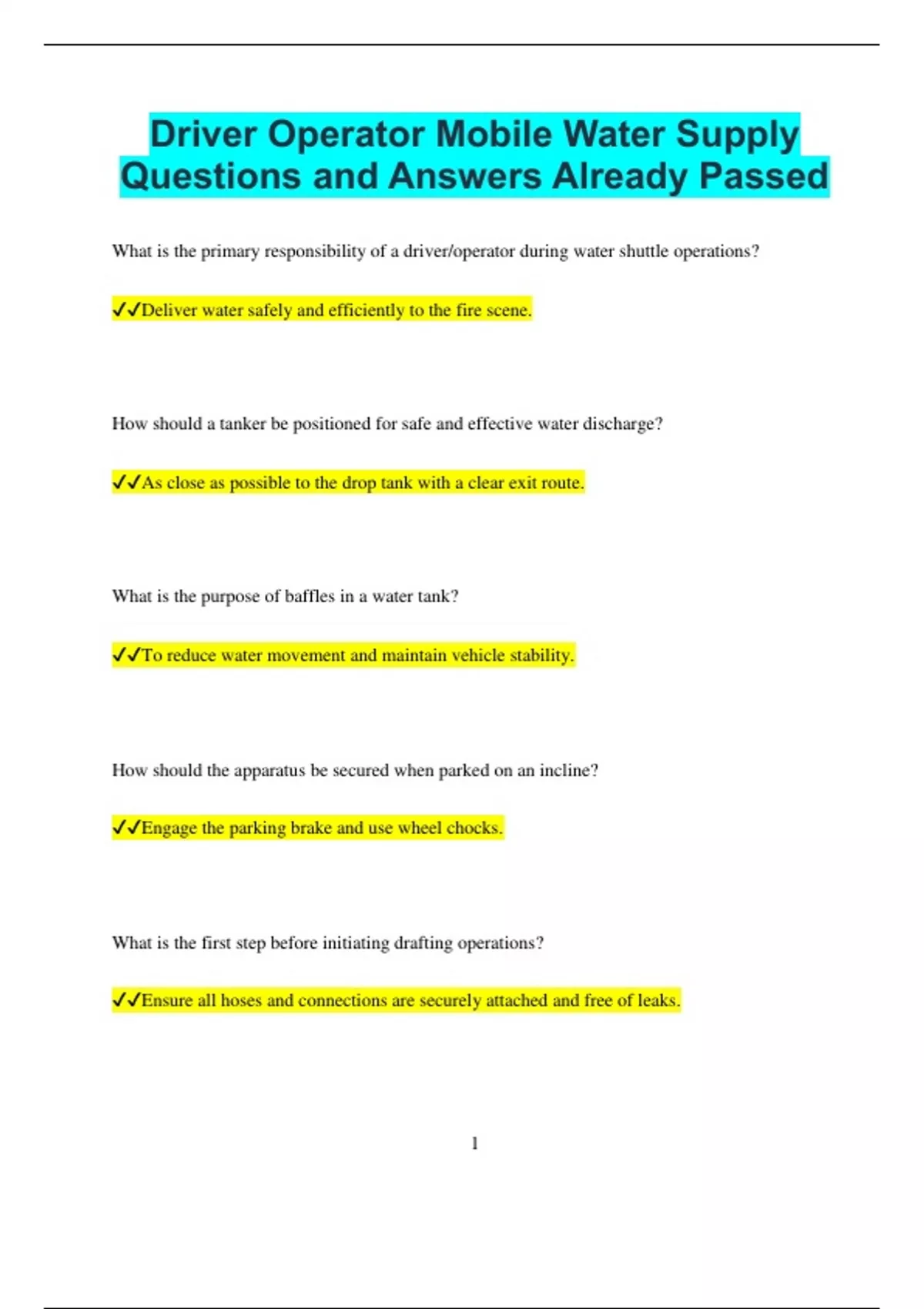 Driver Operator Mobile Water Supply Questions and Answers Already Passed What is the primary responsibility of a driver/operator during water shuttle operations? Deliver water safely and efficiently to the fire scene. How should a tanker be positioned for safe and effective water discharge? As close as possible to the drop tank with a clear exit route. What is the purpose of baffles in a water tank? To reduce water movement and maintain vehicle stability. How should the apparatus be secured when parked on an incline? Engage the parking brake and use wheel chocks. What is the first step before initiating drafting operations? Ensure all hoses and connections are securely attached and free of leaks. 2 How can turbulence in a portable tank be minimized? Direct water into the tank using diffusers or gently flow water into the corner. What should be done if a pump overheats during prolonged operations? Reduce the workload or circulate water through the pump to cool it down. What is the function of a dump valve on a tanker? To quickly release water into a portable tank at the fire scene. How can cavitation be avoided during drafting operations? Ensure the intake strainer is fully submerged and there are no air leaks. What should be checked if the pump fails to draft water? Inspect for air leaks, clogs, or improper priming. What is the recommended way to prevent water hammer during operations? Open and close valves slowly and smoothly. 3 What is a critical step when switching from drafting to tank operations? Verify the intake valve is closed before transitioning to prevent air from entering the pump. How should portable tanks be set up to maximize water availability? Position multiple tanks in a series or connect them with jet siphons. What is the purpose of a vent on the water tank? To allow air to escape and prevent pressure build-up during filling and draining. What should be done immediately after completing water supply operations? Flush and clean the pump and hoses, then inspect for any damage. How should the apparatus approach a fill site? At a controlled speed with clear communication to personnel at the site. What is the role of a fill site manager during water supply operations? To coordinate tanker filling and maintain efficiency at the site. 4 What safety measure should be taken when filling the tank from a pressurized source? Monitor the flow rate to prevent overfilling or excessive pressure. How can sediment build-up in the water tank be minimized? Flush the tank after use, especially when drafting from natural water sources. What is the purpose of a thermal relief valve in a pump