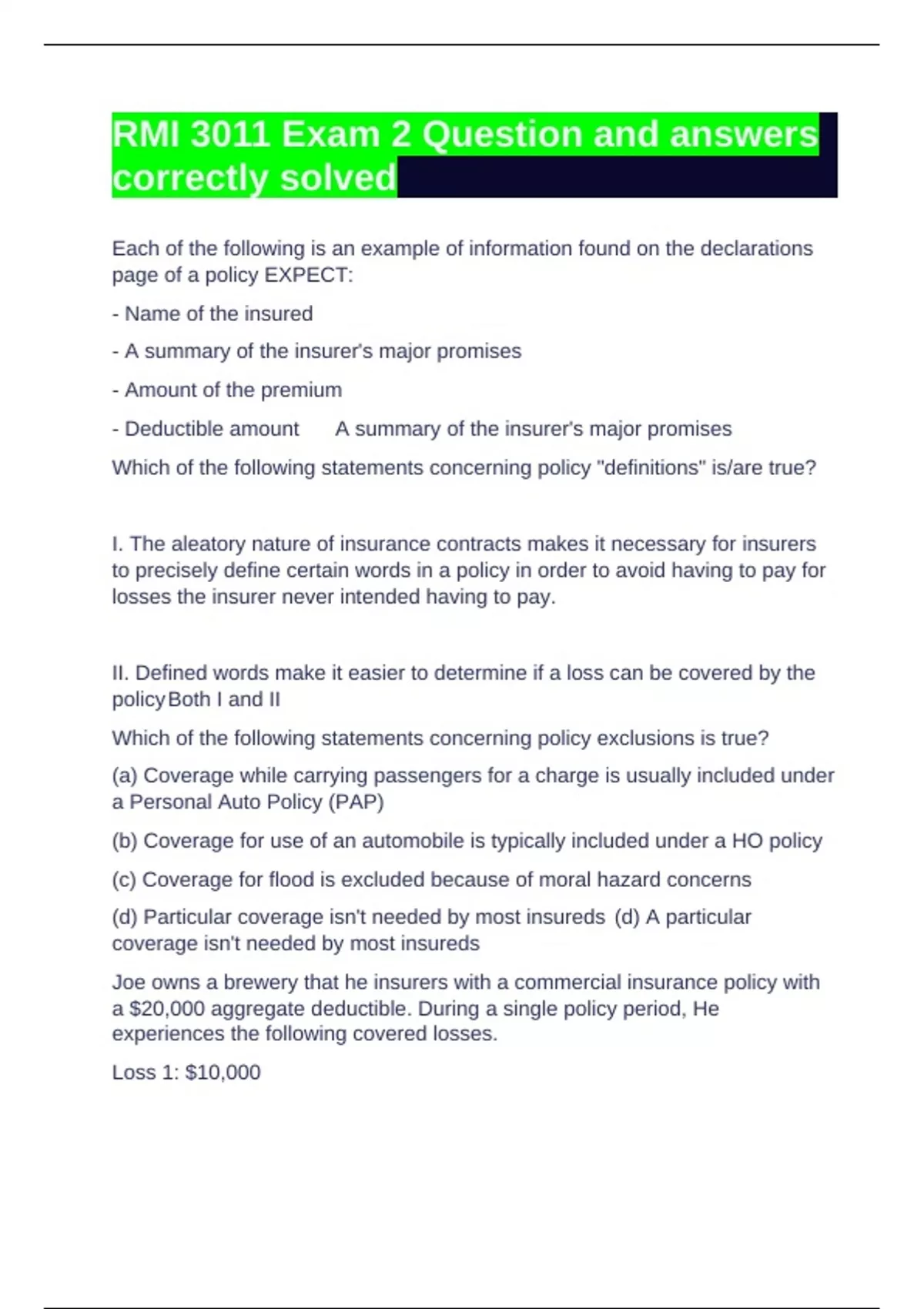 - Deductible amount A summary of the insurer's major promises