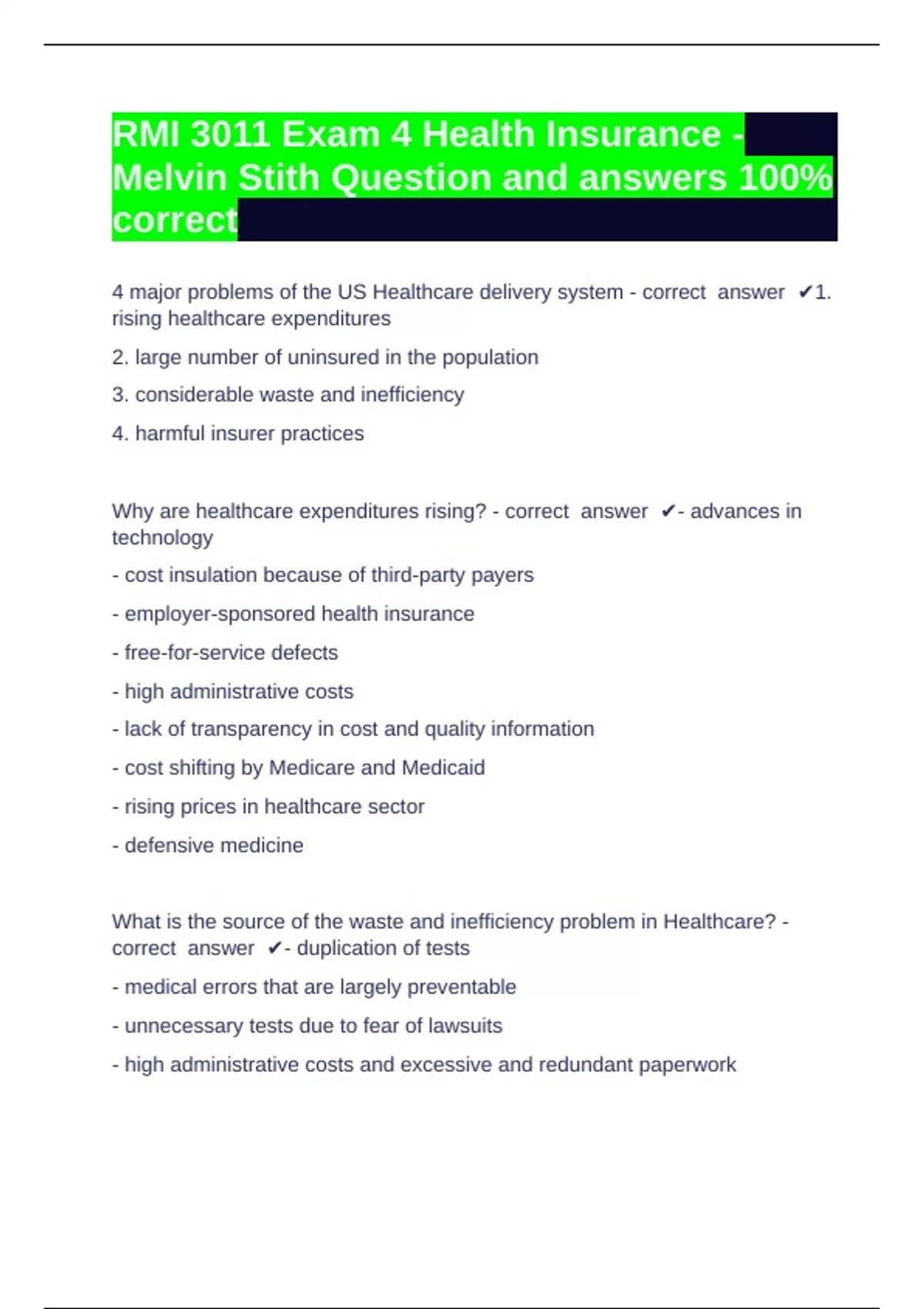 RMI 3011 Exam 4 Health Insurance - Melvin Stith RMI 3011 Florida State University -Question and answers 100% correct 4 major problems of the US Healthcare delivery system - correct answer 1. rising healthcare expenditures 2. large number of uninsured in the population 3. considerable waste and inefficiency 4. harmful insurer practices Why are healthcare expenditures rising? - correct answer - advances in technology - cost insulation because of third-party payers - employer-sponsored health insurance - free-for-service defects - high administrative costs - lack of transparency in cost and quality information - cost shifting by Medicare and Medicaid - rising prices in healthcare sector - defensive medicine What is the source of the waste and inefficiency problem in Healthcare? - correct answer - duplication of tests - medical errors that are largely preventable - unnecessary tests due to fear of lawsuits - high administrative costs and excessive and redundant paperwork - readmissions i