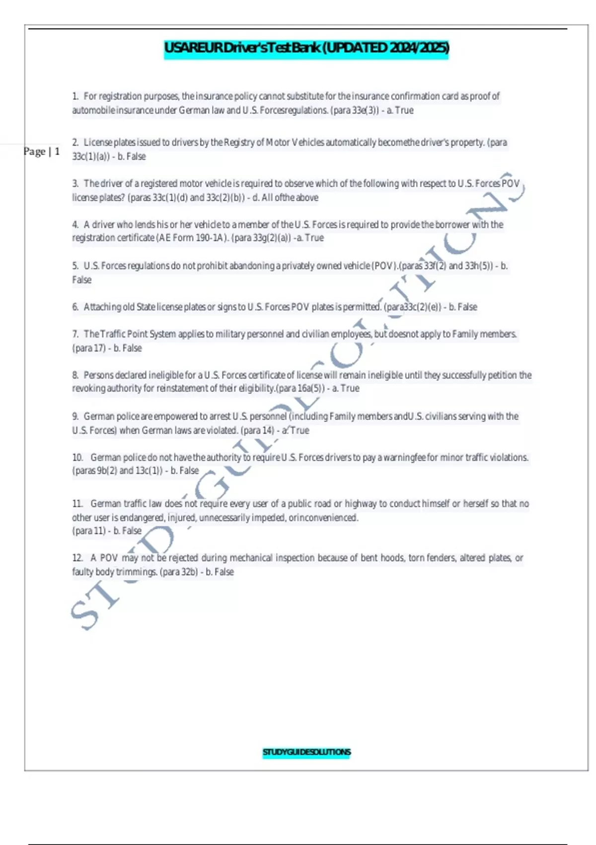 , USAREUR Driver's Test Bank (UPDATED 2024/2025)