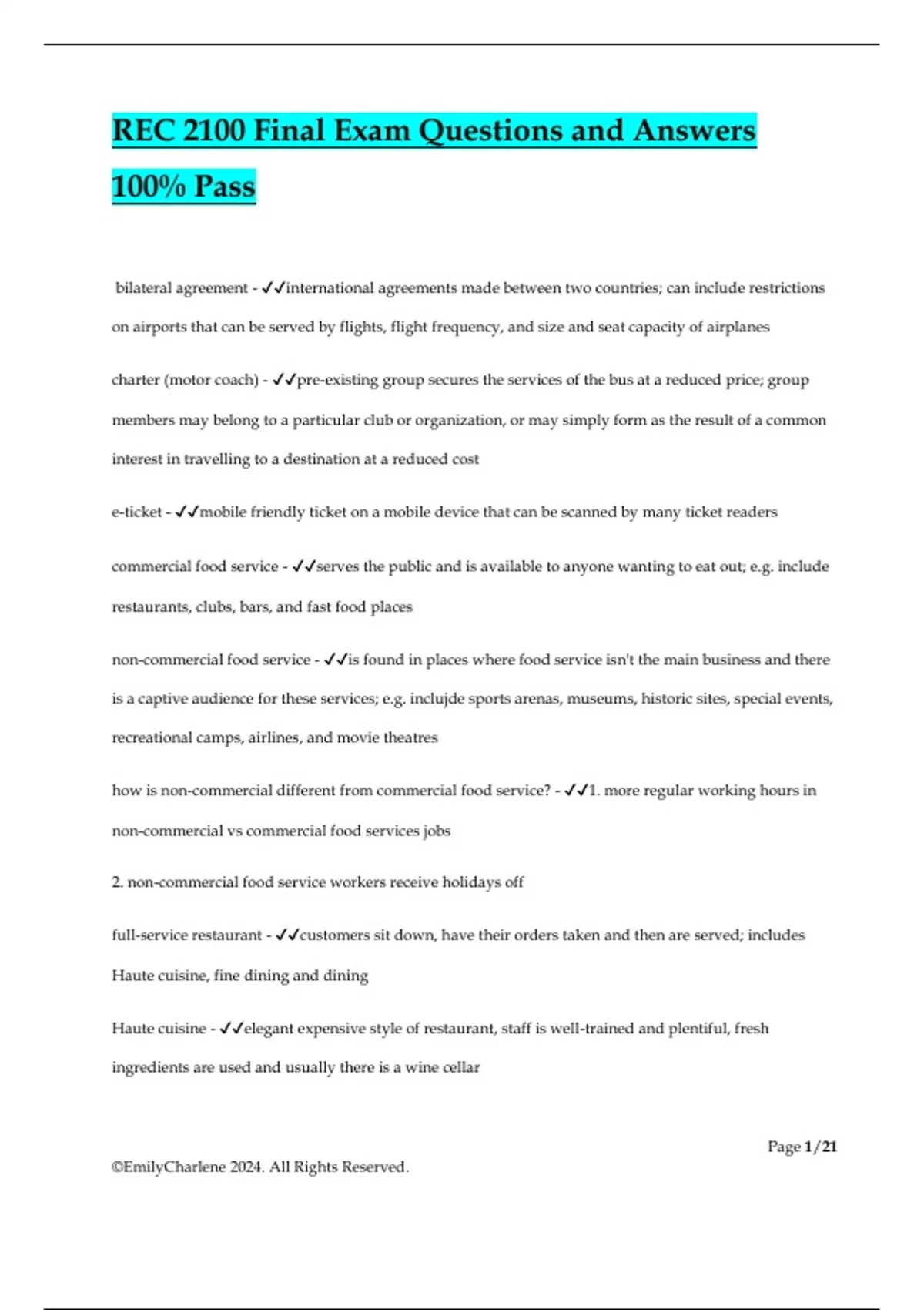REC 2100 Final Exam Questions and Answers 100% Pass bilateral agreement - international agreements made between two countries; can include restrictions on airports that can be served by flights, flight frequency, and size and seat capacity of airplanes charter (motor coach) - pre-existing group secures the services of the bus at a reduced price; group members may belong to a particular club or organization, or may simply form as the result of a common interest in travelling to a destination at a reduced cost e-ticket - mobile friendly ticket on a mobile device that can be scanned by many ticket readers commercial food service - serves the public and is available to anyone wanting to eat out; e.g. include restaurants, clubs, bars, and fast food places non-commercial food service - is found in places where food service isn't the main business and there is a captive audience for these services; e.g. inclujde sports arenas, museums, historic sites, special events, recreational camps, airlines, and movie theatres how is non-commercial different from commercial food service? - 1. more regular working hours in non-commercial vs commercial food services jobs 2. non-commercial food service workers receive holidays off full-service restaurant - customers sit down, have their orders taken and then are served; includes Haute cuisine, fine dining and dining Haute cuisine - elegant expensive style of restaurant, staff is well-trained and plentiful, fresh ingredients are used and usually there is a wine cellar Page 2/21 ©EmilyCharlene 2024. All Rights Reserved. fine dining - elegant service just not has fancy as a haute cuisine restaurant; don't have as many levels of wait staff dining - growing category due to increasing demand for more casual dining and fresh eclectic or fusion foods; this is the largest grouping of full service restaurants that includes bistros, cafes, tratorrias, pubs, family style, speciality, ethnic, theme, and buffet limited service restaurants - food service that involves little or no table service available; customers order and pick up their own food and often clear their own table; commonly these are fast food restaurants but this grouping also includes cafeterias, takeout, and food courts, the key is usually self service fast food restaurants - high speed service, high customer turnover, disposable utensils/plates/cups, etc., limited menus, controlled portion sizes, customers serve themselves, many are franchises, and assembly line food production occurs drinking establishments - includes bars, taverns, pubs, cocktail lounges, and nightclubs; some of these may be self service while others may be full service main factors that have led to the success of fast foods - 1. the discovery of frozen foods 2. the rise in automobile ownership and travel by same 3. franchising 4. the faster pace of life and the time poverty we experience regularly tourism sales dependent - earn more than 50% of their sales revenue from tourists; if the tourist business dried up, these restaurants wouldn't be profitable tourism profit dependent - earn 20-50% of their sales revenue from tourists so they couldn't be profitable without tourists; most restaurants fit into this category Page 3/21 ©EmilyCharlene 2024. All Rights Reserved. resident sales dependent - earn less than 20% of their sales revenue from tourists; these restaurants may profit from tourist dollars but can operate without them; success is easier in big cities than smaller ones due to the high number of potential customers to draw from environmental concerns (food & bev industry) - -minimizing the use of plastics and styrofoam which take years to decompose - biodegradable containers are popular -restaurants using products raised and grown locally to reduce carbon emissions -organically grown food takeout - -"home meal replacement" and includes vending machines -takeout restaurants offer the best chance for success among new ventures -leads to more quick service meals and buying prepared food from grocery outlets or takeout vendors casual dining - due to less discretionary income, casual dining is replacing fine dining, and restaurants are becoming smaller and more intimate to be profitable dining out with children - availability of a kids menu is