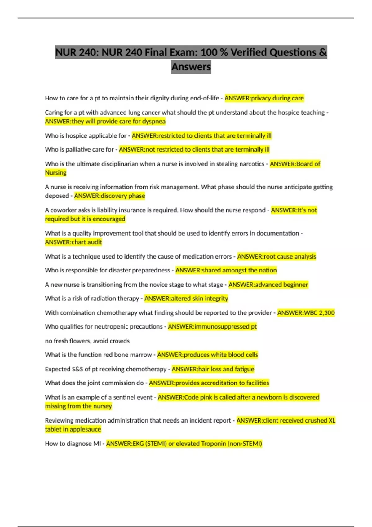 NUR 240: NUR 240 Final Exam: 100 % Verified Questions &