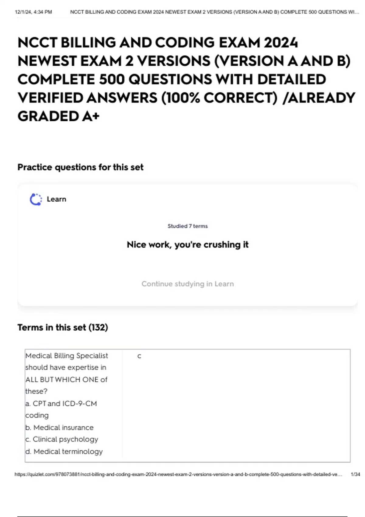 https://quizlet.com/978073881/ncct-billing-and-coding-exam-2024-newest-exam-2-versions-version-a-and-b-complete-500-questions-with-detailed-ve… 1/34