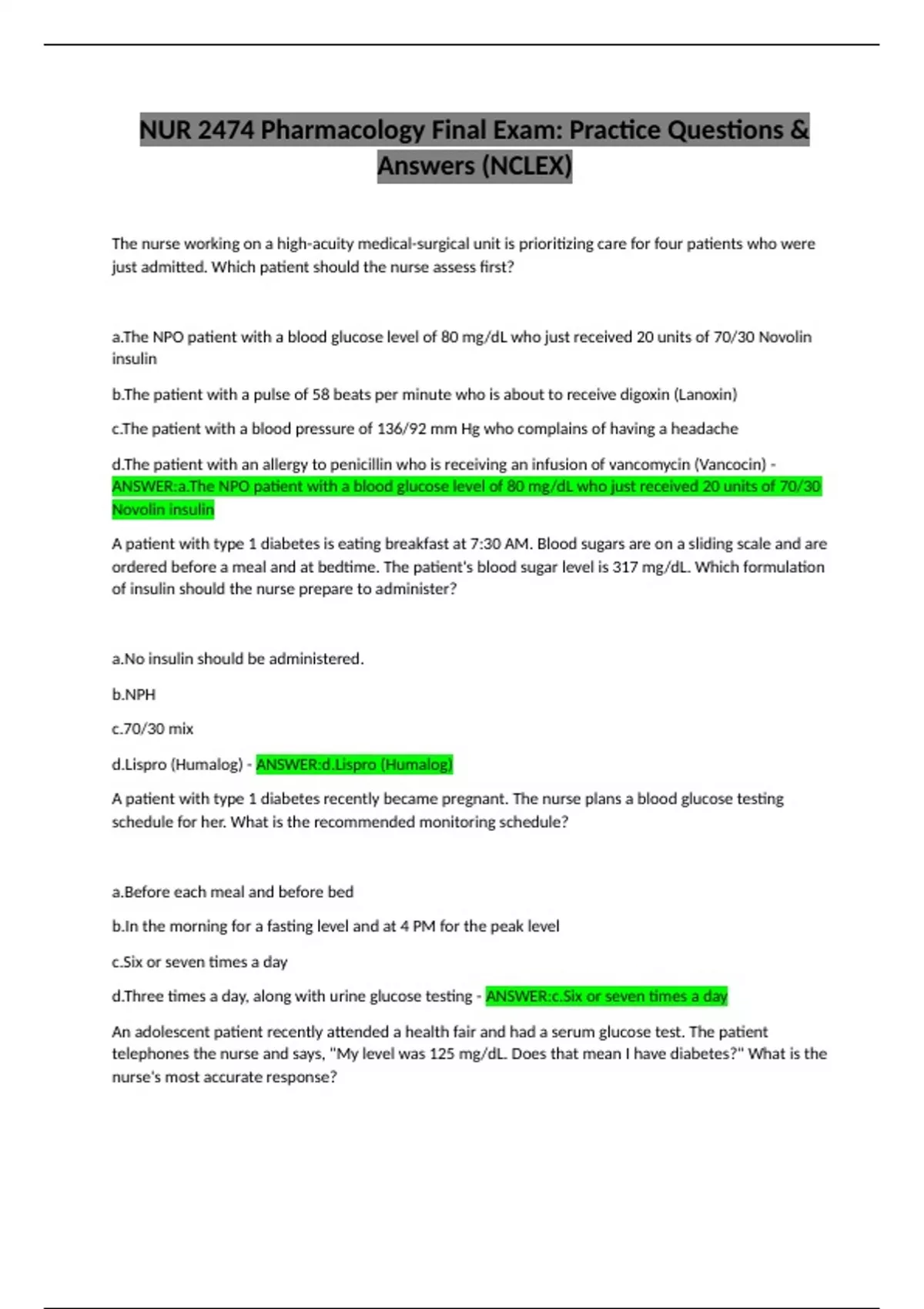 NUR 2474 Pharmacology Final Exam: Practice Questions & Answers (NCLEX)
