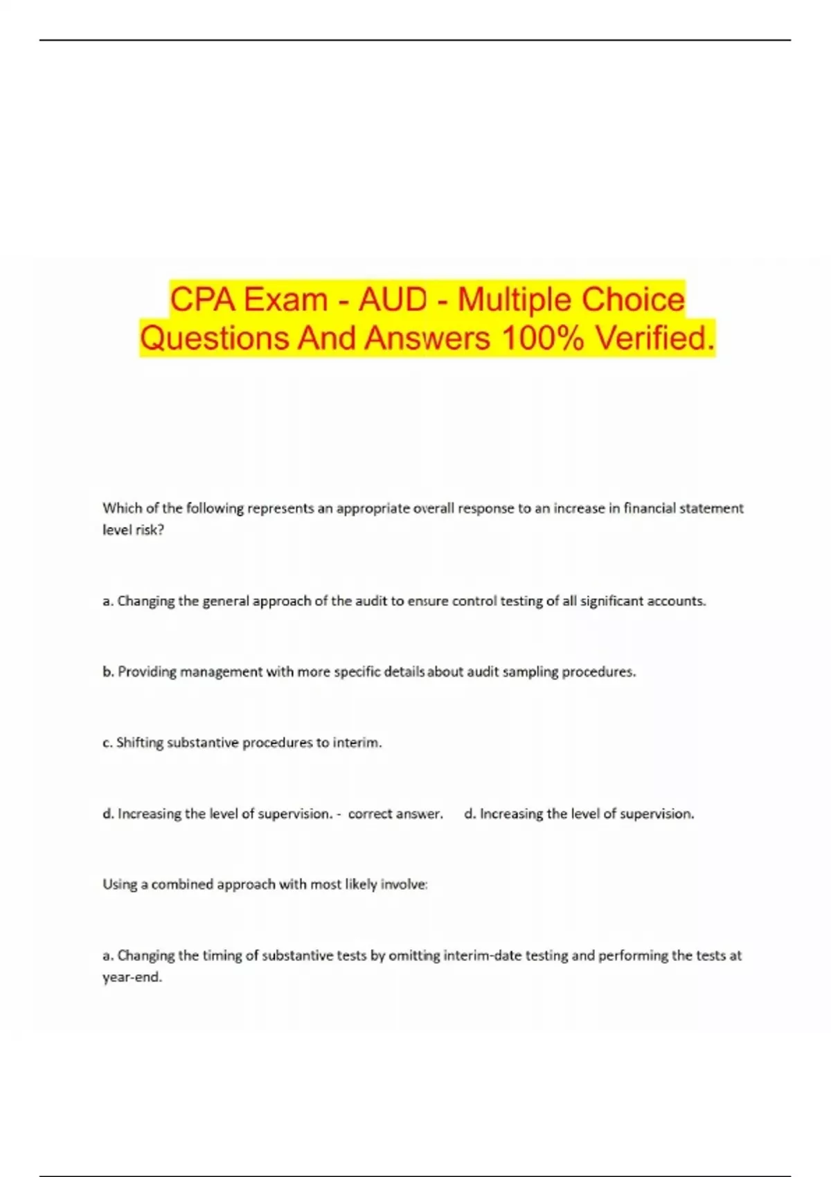 CPA Exam - AUD - Multiple Choice Questions And Answers 100% Verified.CPA Exam - AUD - Multiple Choice Questions And Answers 100% Verified.CPA Exam - AUD - Multiple Choice Questions And Answers 100% Verified.CPA Exam - AUD - Multiple Choice Questions And Answers 100% Verified.CPA Exam - AUD - Multiple Choice Questions And Answers 100% Verified.