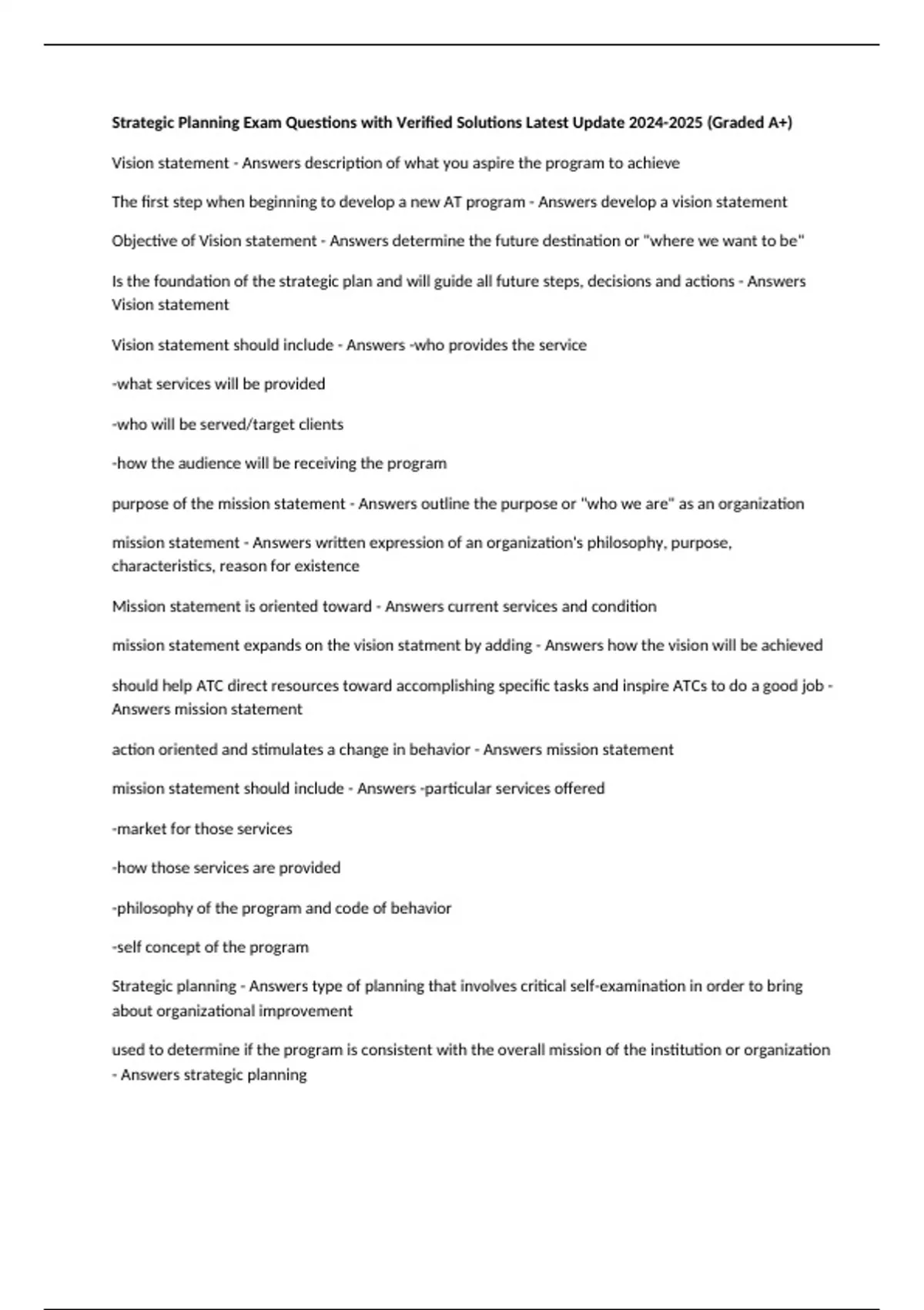 Strategic planning - Answers type of planning that involves critical self-examination in order to bring