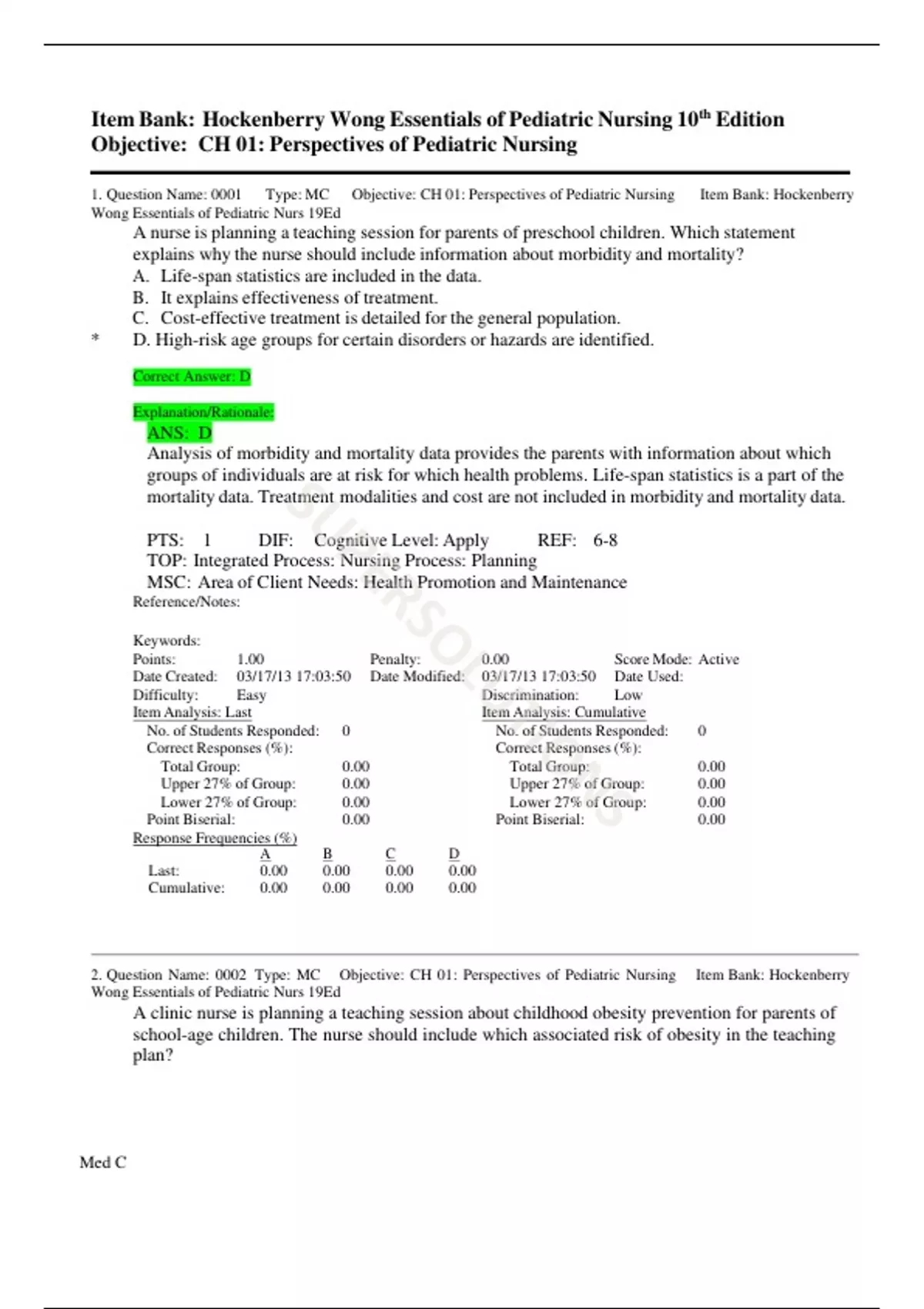 1. Question Name: 0001 Type: MC Objective: CH 01: Perspectives of Pediatric Nursing Item Bank: Hockenberry