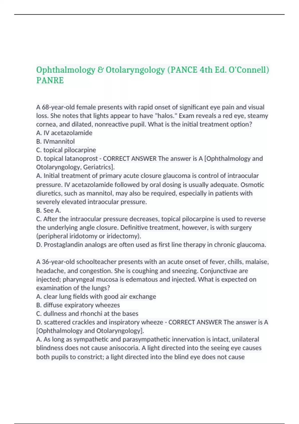 Ophthalmology & Otolaryngology (PANCE 4th Ed. O'Connell) PANRE A 68-year-old female presents with rapid onset of significant eye pain and visual loss. She notes that lights appear to have "halos." Exam reveals a red eye, steamy cornea, and dilated, nonreactive pupil. What is the initial treatment option? A. IV acetazolamide B. IVmannitol C. topical pilocarpine D. topical latanoprost - CORRECT ANSWER The answer is A [Ophthalmology and Otolaryngology, Geriatrics]. A. Initial treatment of primary acute closure glaucoma is control of intraocular pressure. IV acetazolamide followed by oral dosing is usually adequate. Osmotic diuretics, such as mannitol, may also be required, especially in patients with severely elevated intraocular pressure. B. See A. C. After the intraocular pressure decreases, topical pilocarpine is used to reverse the underlying angle closure. Definitive treatment, however, is with surgery (peripheral iridotomy or iridectomy). D. Prostaglandin analogs are often used as first line therapy in chronic glaucoma. A 36-year-old schoolteacher presents with an acute onset of fever, chills, malaise, headache, and congestion. She is coughing and sneezing. Conjunctivae are injected; pharyngeal mucosa is edematous and injected. What is expected on examination of the lungs? A. clear lung fields with good air exchange B. diffuse expiratory wheezes C. dullness and rhonchi at the bases D. scattered crackles and inspiratory wheeze - CORRECT ANSWER The answer is A [Ophthalmology and Otolaryngology]. A. As long as sympathetic and parasympathetic innervation is intact, unilateral blindness does not cause anisocoria. A light directed into the seeing eye causes both pupils to constrict; a light directed into the blind eye does not cause any response in either eye. B. See A. C. See A. D. See A. A basketball player presents after being struck above the eye with an opponent's elbow. Exam is significant for bruising around the eye as well as bleeding into the anterior chamber. Computed tomography is negative for fracture. What is the most appropriate treatment? A. NSAIDs to reduce pain and swelling B. rest and close ophthalmologic follow up C. surgical intervention D. vitamin K to induce clotting - CORRECT ANSWER The answer is B [Ophthalmology and Otolaryngology]. A. NSAIDs and any drugs that affect coagulation should be avoided due to increased risk of secondary hemorrhage. B. An injury that causes hyphema has the risk of secondary hemorrhage, which can lead to problematic glaucoma and permanent visual loss. The patient should rest until complete resolution; daily ophthalmologic assessment is recommended. C. Surgical intervention may be indicated in blowout fractures. D. Vitamin K deficiency in healthy people is very rare. It may be given to reverse the effects of warfarin.
