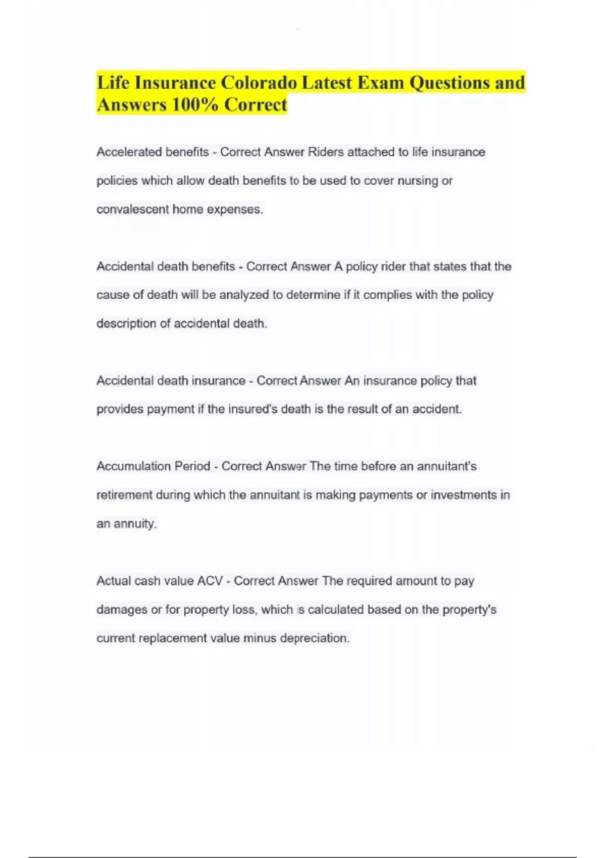 Life Insurance Colorado Latest Exam Questions and Answers 100% Correct Accelerated benefits - Correct Answer Riders attached to life insurance policies which allow death benefits to be used to cover nursing or convalescent home expenses. Accidental death benefits - Correct Answer A policy rider that states that the cause of death will be analyzed to determine if it complies with the policy description of accidental death. Accidental death insurance - Correct Answer An insurance policy that provides payment if the insured's death is the result of an accident. Accumulation Period - Correct Answer The time before an annuitant's retirement during which the annuitant is making payments or investments in an annuity. Actual cash value ACV - Correct Answer The required amount to pay damages or for property loss, which is calculated based on the property's current replacement value minus depreciation.