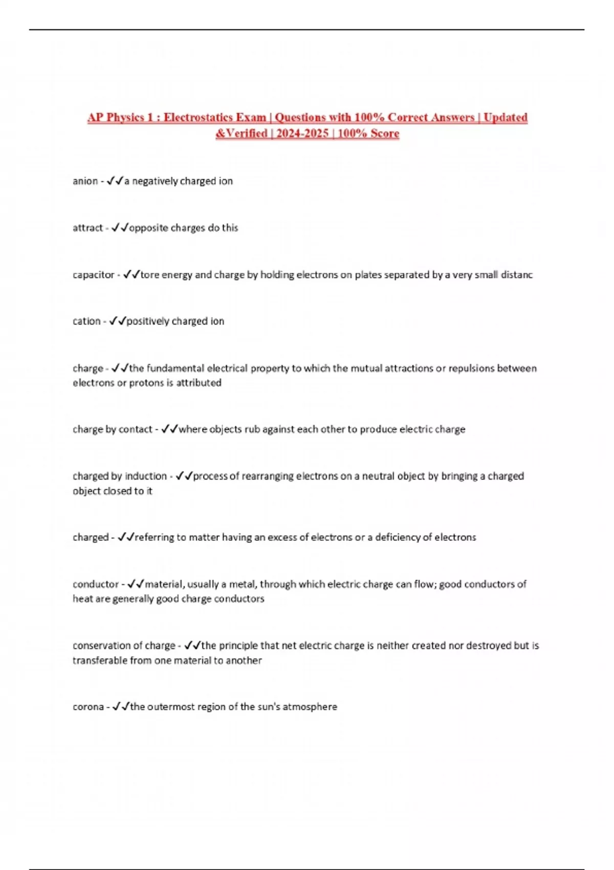 AP Physics 1 : Electrostatics Exam | Questions with 100% Correct Answers | Updated &Verified | | 100% Score