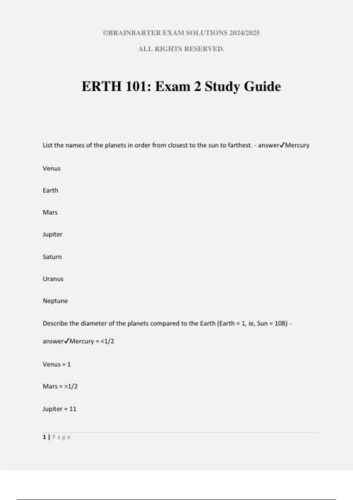 ©BRAINBARTER EXAM SOLUTIONS 2024/2025 ALL RIGHTS RESERVED. 1 | P a g e ERTH 101: Exam 2 Study Guide List the names of the planets in order from closest to the sun to farthest. - answerMercury Venus Earth Mars Jupiter Saturn Uranus Neptune Describe the diameter of the planets compared to the Earth (Earth = 1, ie, Sun = 108) - answerMercury = 1/2 Venus = 1 Mars = 1/2 Jupiter = 11 ©BRAINBARTER EXAM SOLUTIONS 2024/2025 ALL RIGHTS RESERVED. 2 | P a g e Saturn = 9 Uranus = 4 Neptune = 4 Describe differentiation. - answerDifferentiation is when an object has separate, different layers of density. The core, mantle and crust of the Earth is an example of differentiation. Conduction - answerexchange of heat (from hot to cold) through touch Radiation - answerexchange of heat (from hot to cold) through light Convection - answerexchange of heat (from hot to cold) through a convective fluid, which moves the energy. Bodies are not touching Density - answermeasurement of how tightly packed the molecules in the object are What is the formula for density? - answerD = mass/volume Plate tectonics - answerplates are being pushed around by the convective motion underneath them Describe what spreading centers are and provide an example - answercrust pulls apart and mantle material fills up gap, ie, Red Sea, Mid-Atlantic Rift Describe what subduction is and provide an example - answerone plate pushed under another plate, and as they rub together, they heat up and form volcanoes and mountains, i.e., Mt. St. Helens