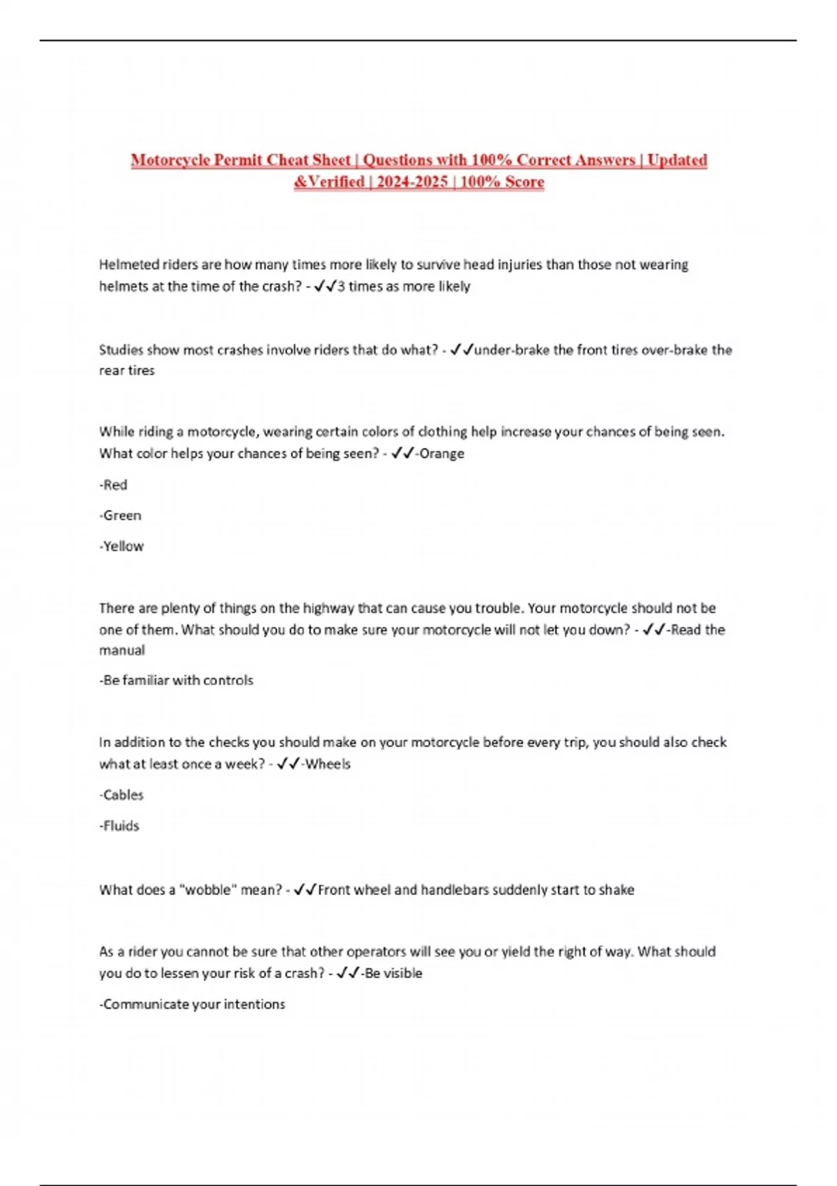 Motorcycle Permit Cheat Sheet | Questions with 100% Correct Answers | Updated &Verified | | 100% Score