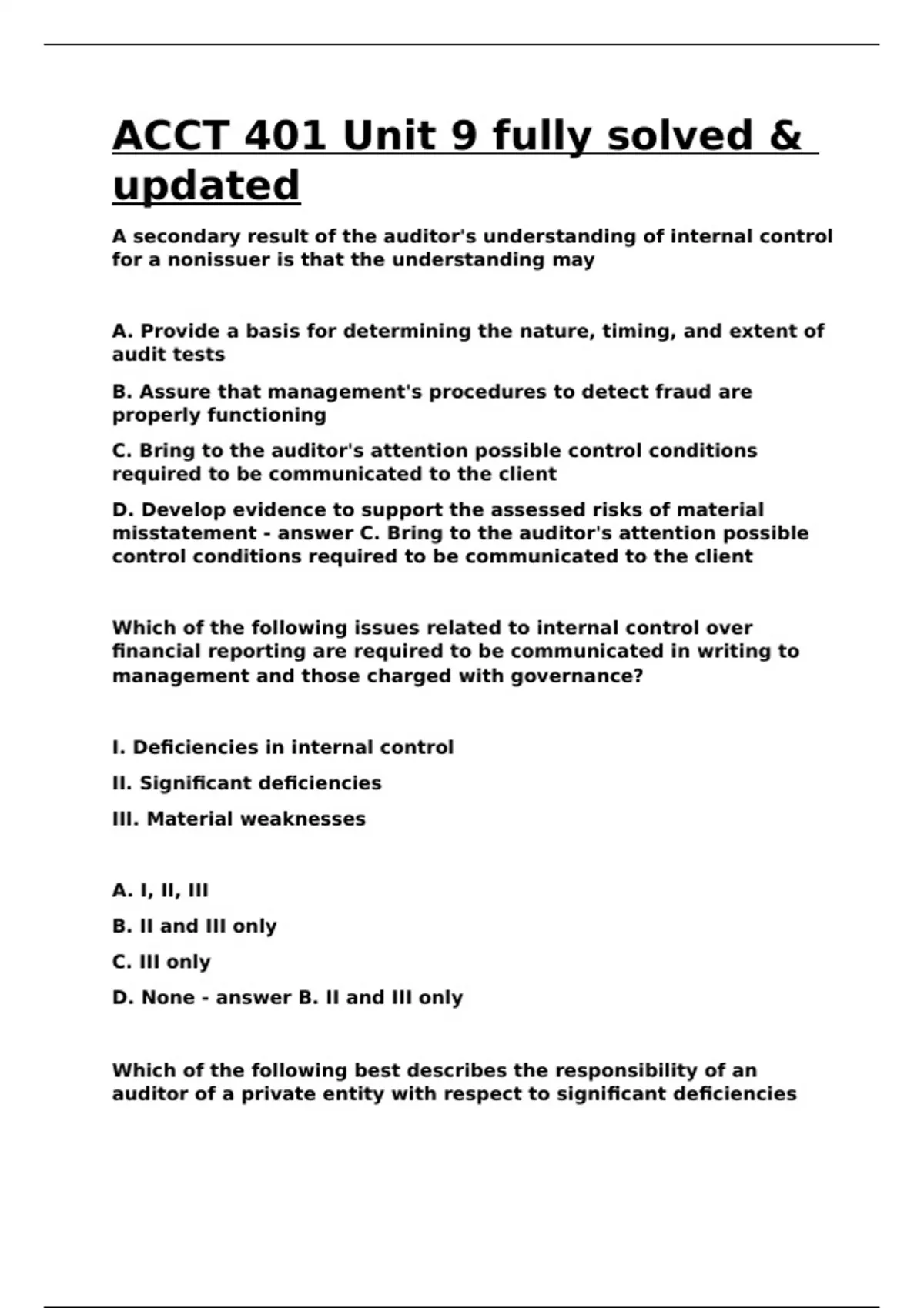 answer C. An auditor's report on significant control deficiencies