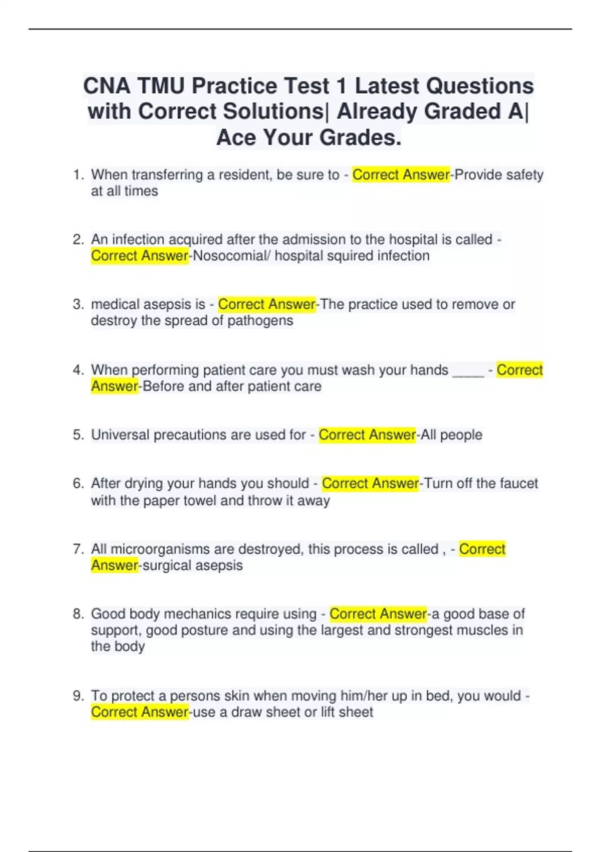 CNA TMU Practice Test 1 Latest Questions with Correct Solutions| Already Graded A| Ace Your Grades.