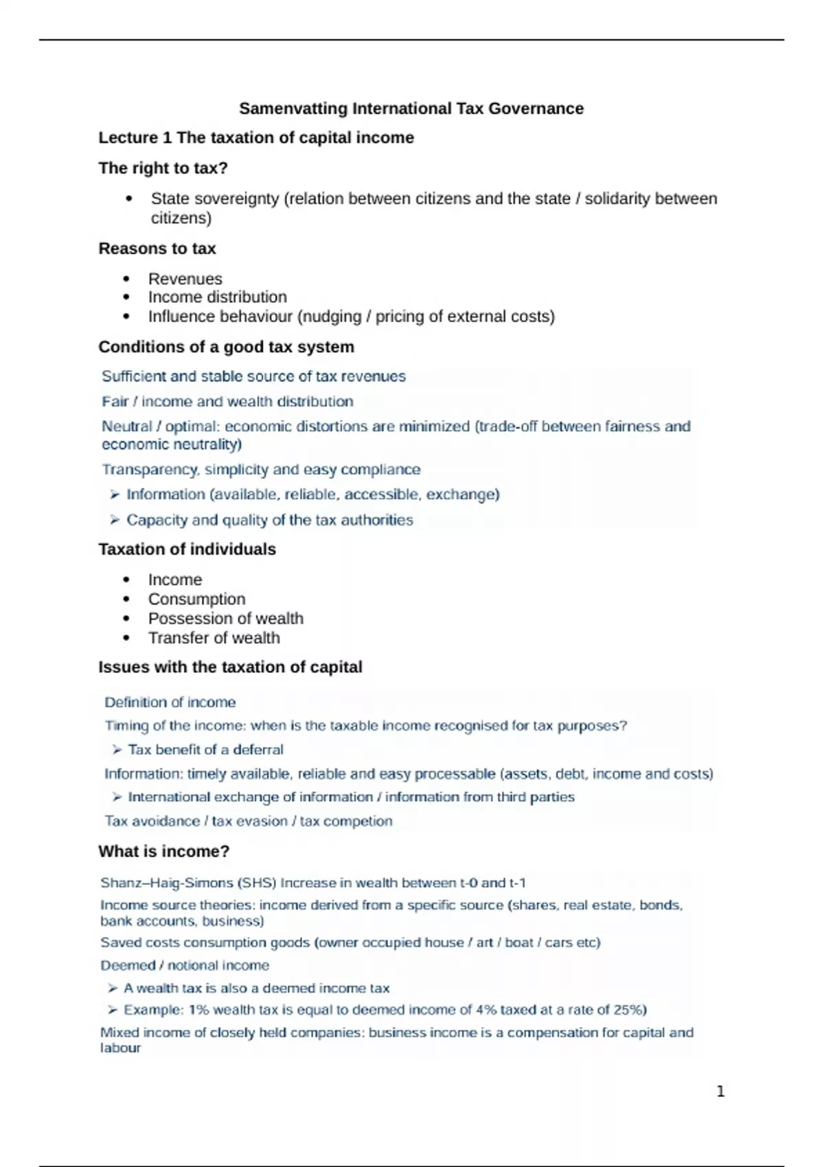 Samenvatting Colleges International Tax Governance. Also the assignments and graphs in the colleges