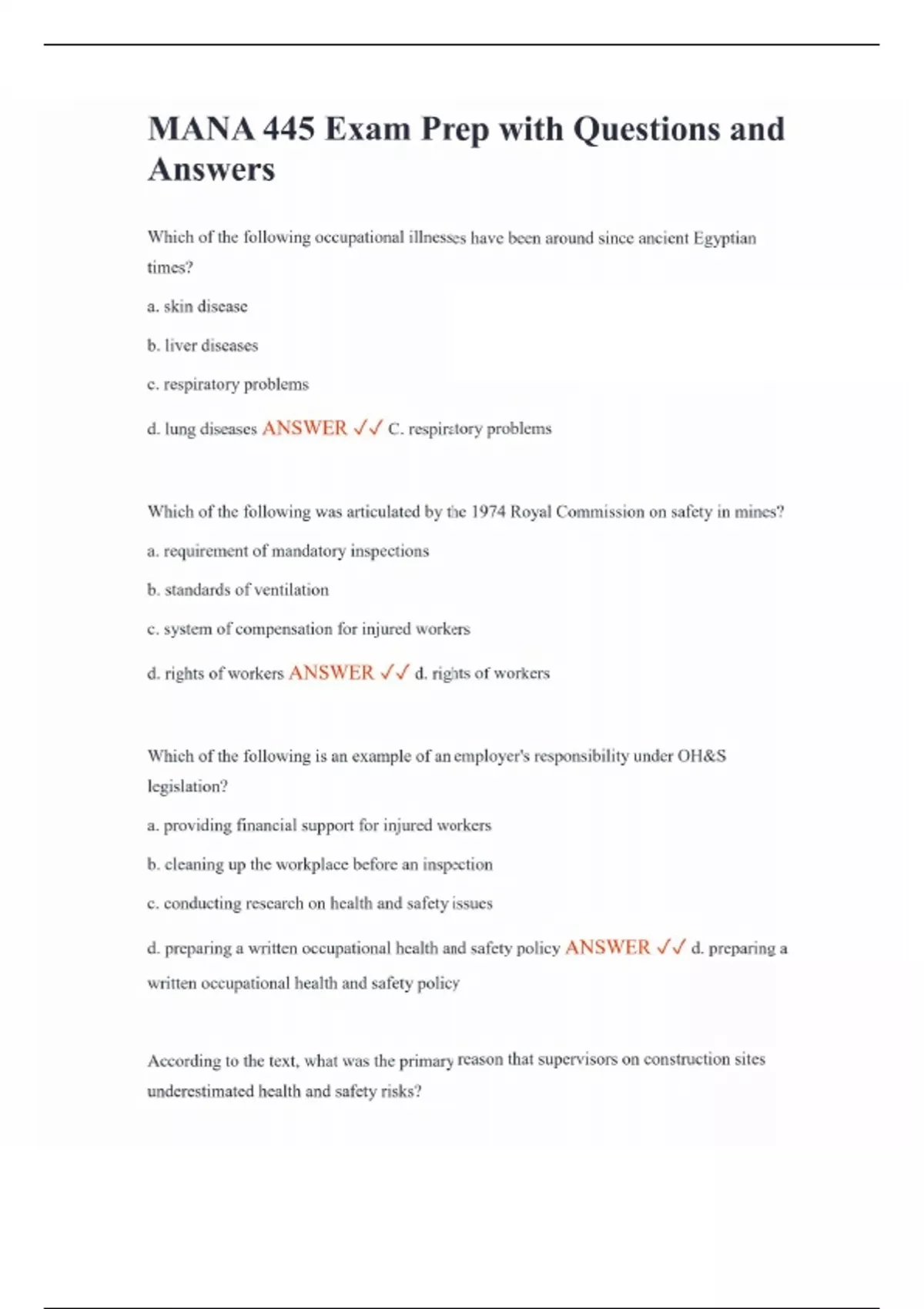 MANA 445 Exam Prep with Questions and Answers Which of the following occupational illnesses have been around since ancient Egyptian times? a. skin disease b. liver diseases c. respiratory problems d. lung diseases ANSWER C. respiratory problems Which of the following was articulated by the 1974 Royal Commission on safety in mines? a. requirement of mandatory inspections b. standards of ventilation c. system of compensation for injured workers d. rights of workers ANSWER d. rights of workers Which of the following is an example of an employer's responsibility under OH&S legislation? a. providing financial support for injured workers b. cleaning up the workplace before an inspection c. conducting research on health and safety issues d. preparing a written occupational health and safety policy ANSWER d. preparing a written occupational health and safety policy According to the text, what was the primary reason that supervisors on construction sites underestimated health and safety risks? a. they could not recognize unsafe conditions