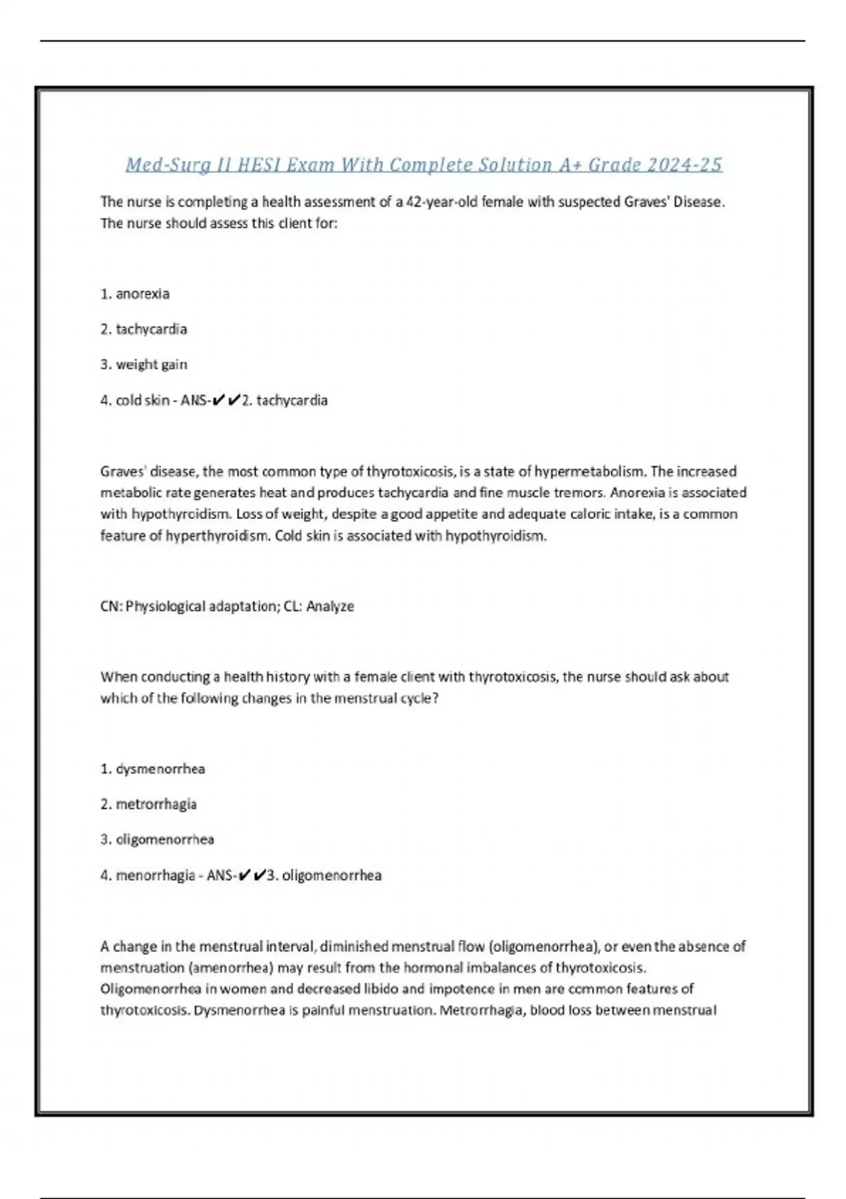 Med-Surg II HESI Exam With Complete Solution A+ Grade 2024-25 The nurse is completing a health assessment of a 42-year-old female with suspected Graves' Disease. The nurse should assess this client for: 1. anorexia 2. tachycardia 3. weight gain 4. cold skin - ANS-2. tachycardia Graves' disease, the most common type of thyrotoxicosis, is a state of hypermetabolism. The increased metabolic rate generates heat and produces tachycardia and fine muscle tremors. Anorexia is associated with hypothyroidism. Loss of weight, despite a good appetite and adequate caloric intake, is a common feature of hyperthyroidism. Cold skin is associated with hypothyroidism. CN: Physiological adaptation; CL: Analyze When conducting a health history with a female client with thyrotoxicosis, the nurse should ask about which of the following changes in the menstrual cycle? 1. dysmenorrhea 2. metrorrhagia 3. oligomenorrhea 4. menorrhagia - ANS-3. oligomenorrhea A change in the menstrual interval, diminished menstrual flow (oligomenorrhea), or even the absence of menstruation (amenorrhea) may result from the hormonal imbalances of thyrotoxicosis. Oligomenorrhea in women and decreased libido and impotence in men are common features of thyrotoxicosis. Dysmenorrhea is painful menstruation. Metrorrhagia, blood loss between menstrual periods, is a symptom of hypothyroidism. Menorrhagia, excessive bleeding during menstrual periods, is a symptom of hypothyroidism. CN: Physiological adaptation; CL: Analyze A 34-year-old female is diagnosed with hypothyroidism. The nurse should assess the client for which of the following? (Select all that apply.) 1. rapid pulse 2. decreased energy and fatigue 3. weight gain of 10 lbs (4.5 kg) 4. fine, thin hair with hair loss 5. constipation 6. menorrhagia. - ANS-2. decreased energy and fatigue, 3. weight gain of 10 lbs (4.5 kg), 5. constipation, 6. menorrhagia Clients with hypothyroidism exhibit symptoms indicating a lack of thyroid hormone. Bradycardia, decreased energy and lethargy, memory problems, weight gain, coarse hair, constipation, and menorrhagia are common signs and symptoms of hypothyroidism. CN: Physiological adaptation; CL: Analyze Propylthiouracil (PTU) is prescribed for a client with Graves' disease. The nurse should teach the client to immediately report which of the following?....