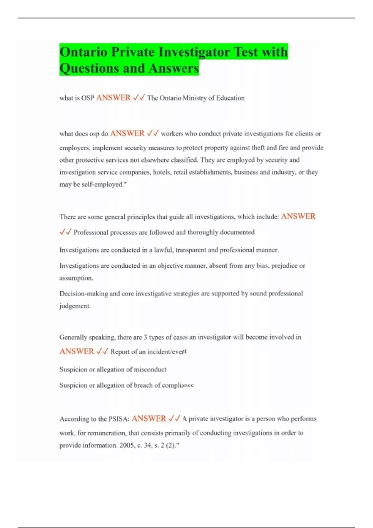 Ontario Private Investigator Test with Questions and Answers what is OSP ANSWER The Ontario Ministry of Education what does osp do ANSWER workers who conduct private investigations for clients or employers, implement security measures to protect property against theft and fire and provide other protective services not elsewhere classified. They are employed by security and investigation service companies, hotels, retail establishments, business and industry, or they may be self-employed." There are some general principles that guide all investigations, which include: ANSWER Professional processes are followed and thoroughly documented Investigations are conducted in a lawful, transparent and professional manner. Investigations are conducted in an objective manner, absent from any bias, prejudice or assumption. Decision-making and core investigative strategies are supported by sound professional judgement. Generally speaking, there are 3 types of cases an investigator will become involved in ANSWER Report of an incident/event Suspicion or allegation of misconduct Suspicion or allegation of breach of compliance According to the PSISA: ANSWER A private investigator is a person who performs work, for remuneration, that consists primarily of conducting investigations in order to provide information. 2005, c. 34, s. 2 (2)."