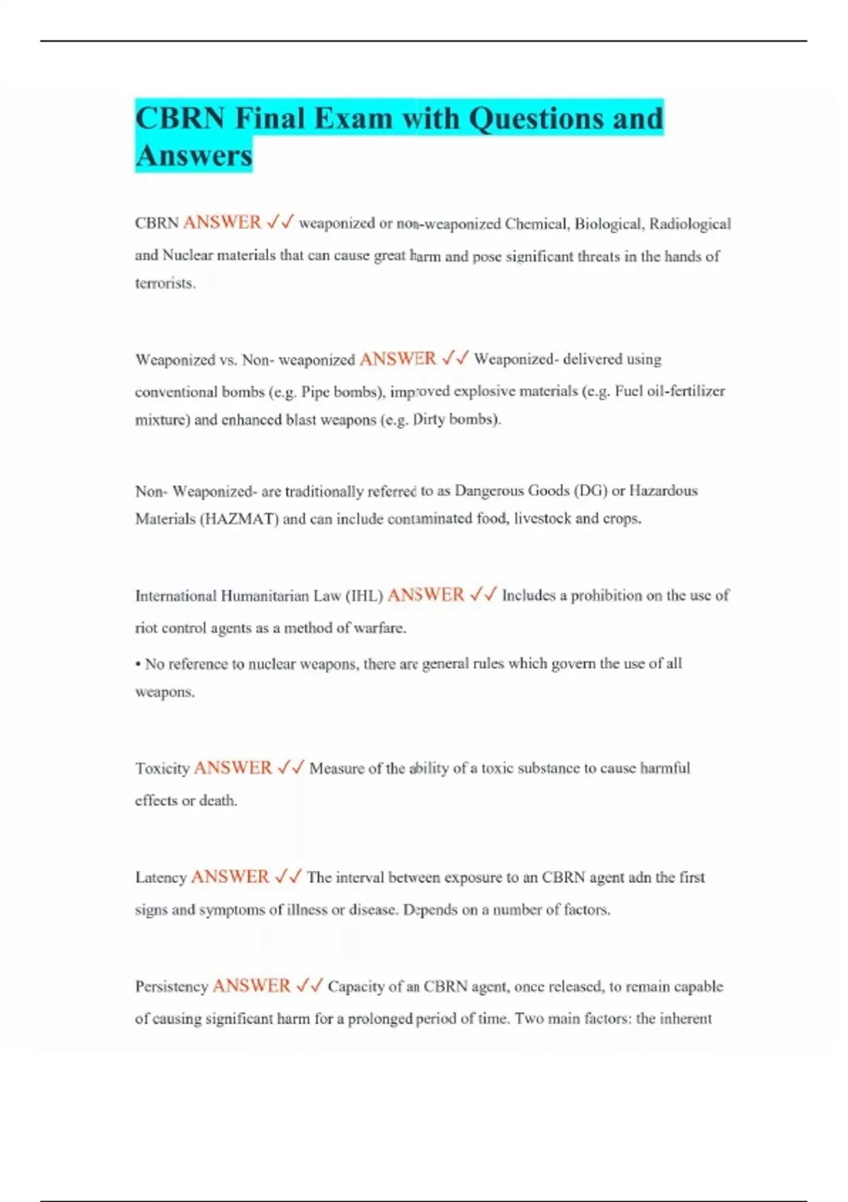 CBRN Final Exam with Questions and Answers CBRN ANSWER weaponized or non-weaponized Chemical, Biological, Radiological and Nuclear materials that can cause great harm and pose significant threats in the hands of terrorists. Weaponized vs. Non- weaponized ANSWER Weaponized- delivered using conventional bombs (e.g. Pipe bombs), improved explosive materials (e.g. Fuel oil-fertilizer mixture) and enhanced blast weapons (e.g. Dirty bombs). Non- Weaponized- are traditionally referred to as Dangerous Goods (DG) or Hazardous Materials (HAZMAT) and can include contaminated food, livestock and crops. International Humanitarian Law (IHL) ANSWER Includes a prohibition on the use of riot control agents as a method of warfare. • No reference to nuclear weapons, there are general rules which govern the use of all weapons. Toxicity ANSWER Measure of the ability of a toxic substance to cause harmful effects or death. Latency ANSWER The interval between exposure to an CBRN agent adn the first signs and symptoms of illness or disease. Depends on a number of factors. Persistency ANSWER Capacity of an CBRN agent, once released, to remain capable of causing significant harm for a prolonged period of time. Two main factors: the inherent physical or chemical stability of the agent and its propensity to degrade in line with certain