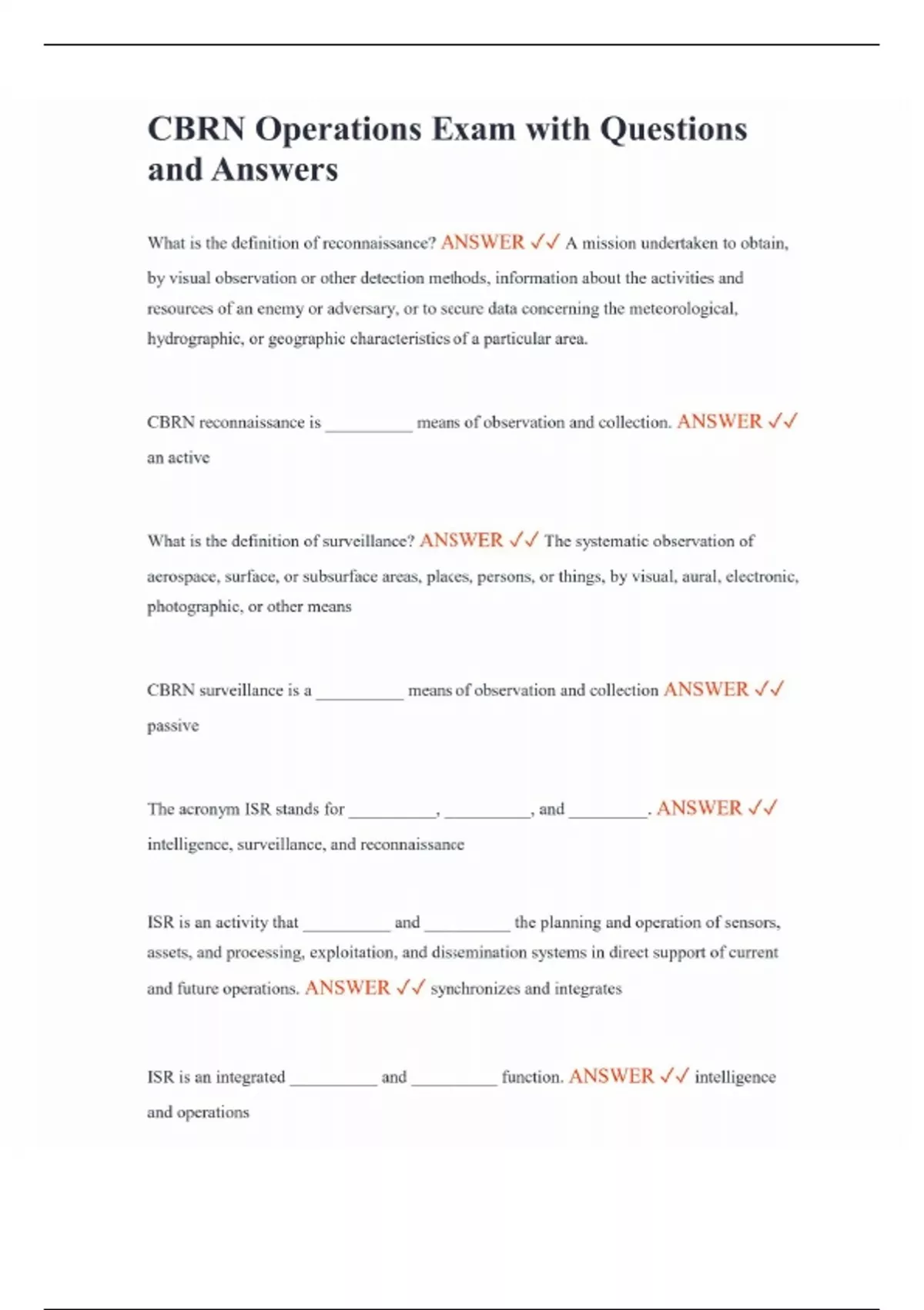 CBRN Operations Exam with Questions and Answers What is the definition of reconnaissance? ANSWER A mission undertaken to obtain, by visual observation or other detection methods, information about the activities and resources of an enemy or adversary, or to secure data concerning the meteorological, hydrographic, or geographic characteristics of a particular area. CBRN reconnaissance is __________ means of observation and collection. ANSWER an active What is the definition of surveillance? ANSWER The systematic observation of aerospace, surface, or subsurface areas, places, persons, or things, by visual, aural, electronic, photographic, or other means CBRN surveillance is a __________ means of observation and collection ANSWER passive The acronym ISR stands for __________, __________, and _________. ANSWER intelligence, surveillance, and reconnaissance ISR is an activity that __________ and __________ the planning and operation of sensors, assets, and processing, exploitation, and dissemination systems in direct support of current and future operations. ANSWER synchronizes and integrates ISR is an integrated __________ and __________ function. ANSWER intelligence