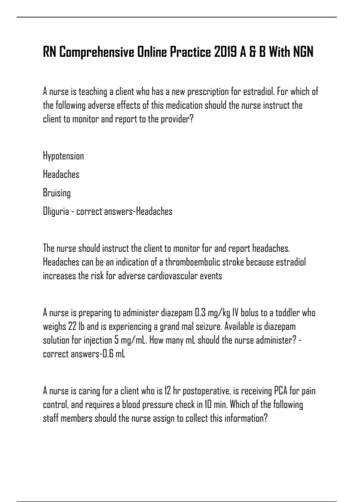RN Comprehensive Online Practice 2019 A & B With NGN A nurse is teaching a client who has a new prescription for estradiol. For which of the following adverse effects of this medication should the nurse instruct the client to monitor and report to the provider? Hypotension Headaches Bruising Oliguria - correct answers-Headaches The nurse should instruct the client to monitor for and report headaches. Headaches can be an indication of a thromboembolic stroke because estradiol increases the risk for adverse cardiovascular events A nurse is preparing to administer diazepam 0.3 mg/kg IV bolus to a toddler who weighs 22 lb and is experiencing a grand mal seizure. Available is diazepam solution for injection 5 mg/mL. How many mL should the nurse administer? - correct answers-0.6 mL A nurse is caring for a client who is 12 hr postoperative, is receiving PCA for pain control, and requires a blood pressure check in 10 min. Which of the following staff members should the nurse assign to collect this information? An RN who is monitoring a client who started receiving a blood transfusion 5 min ago An assistive personnel (AP) who just began performing a bed bath A licensed practical nurse (LPN) who is reinforcing discharge instructions with a client An assistive personnel (AP) who is assisting a client to return to bed - correct answers-An assistive personnel (AP) who is assisting a client to return to bed Performing a blood pressure check is within the range of function of an AP, and the AP should be available to obtain a blood pressure within the specified time A nurse is creating a plan of care for a child who has acute lymphoid leukemia and an absolute neutrophil count of 400/mm^3. Which of the following interventions should the nurse include in the plan? A nurse is teaching a client who has a new prescription for estradiol. For which of the following adverse effects of this medication should the nurse instruct the client to monitor and report to the provider? Hypotension Headaches Bruising Oliguria - correct answers-Headaches The nurse should instruct the client to monitor for and report headaches. Headaches can be an indication of a thromboembolic stroke because estradiol increases the risk for adverse cardiovascular events A nurse is preparing to administer diazepam 0.3 mg/kg IV bolus to a toddler who weighs 22 lb and is experiencing a grand mal seizure. Available is diazepam solution for injection 5 mg/mL. How many mL should the nurse administer? - correct answers-0.6 mL A nurse is caring for a client who is 12 hr postoperative, is receiving PCA for pain control, and requires a blood pressure check in 10 min. Which of the following staff members should the nurse assign to collect this information? An RN who is monitoring a client who started receiving a blood transfusion 5 min ago An assistive personnel (AP) who just began performing a bed bath A licensed practical nurse (LPN) who is reinforcing discharge instructions with a client An assistive personnel (AP) who is assisting a client to return to bed - correct answers-An assistive personnel (AP) who is assisting a client to return to bed Performing a blood pressure check is within the range of function of an AP, and the AP should be available to obtain a blood pressure within the specified time A nurse is creating a plan of care for a child who has acute lymphoid leukemia and an absolute neutrophil count of 400/mm^3. Which of the following interventions should the nurse include in the plan?