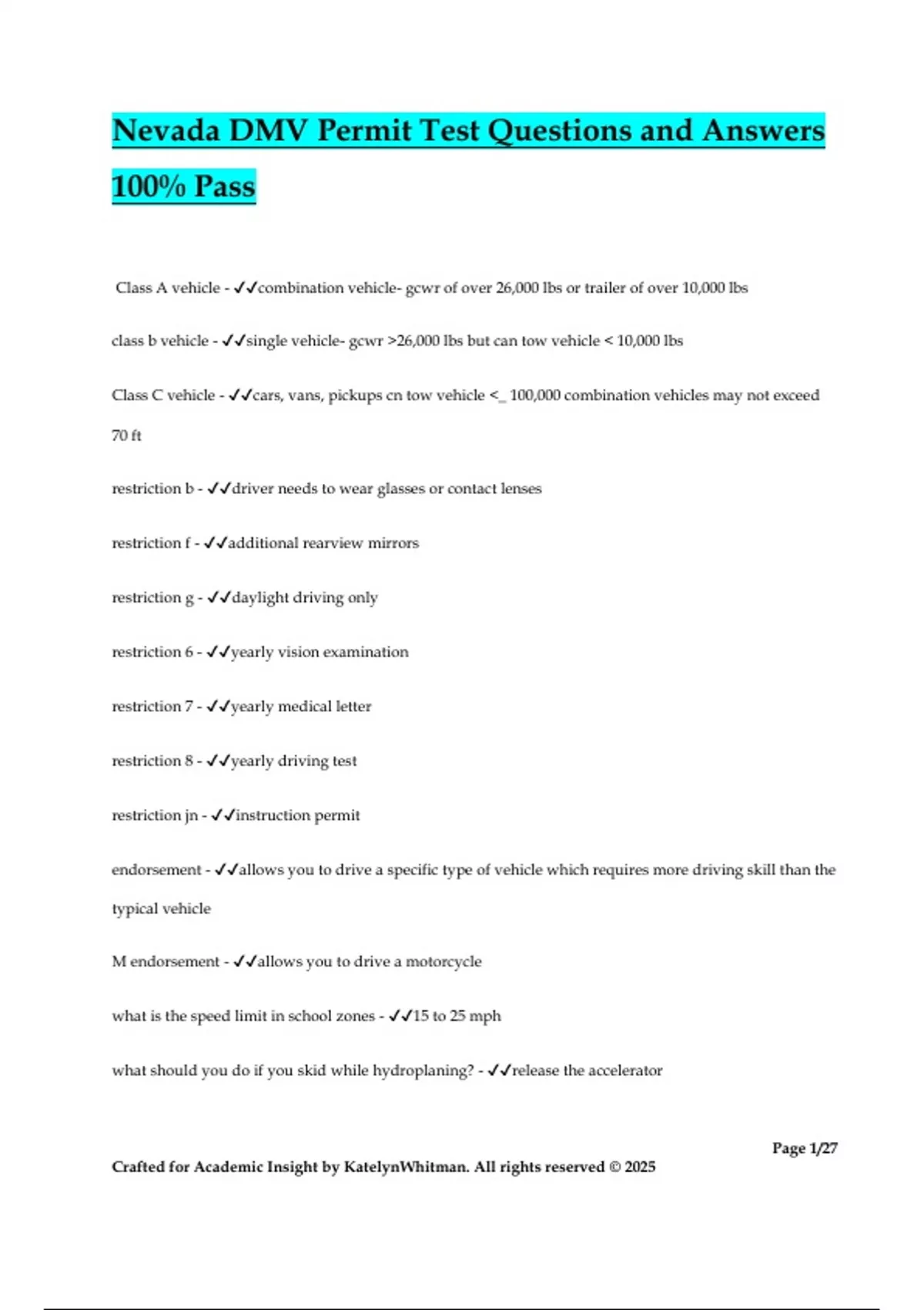 Nevada DMV Permit Test Questions and Answers 100% Pass Class A vehicle - combination vehicle- gcwr of over 26,000 lbs or trailer of over 10,000 lbs class b vehicle - single vehicle- gcwr >26,000 lbs but can tow vehicle < 10,000 lbs Class C vehicle - cars, vans, pickups cn tow vehicle <_ 100,000 combination vehicles may not exceed 70 ft restriction b - driver needs to wear glasses or contact lenses restriction f - additional rearview mirrors restriction g - daylight driving only restriction 6 - yearly vision examination restriction 7 - yearly medical letter restriction 8 - yearly driving test restriction jn - instruction permit endorsement - allows you to drive a specific type of vehicle which requires more driving skill than the typical vehicle M endorsement - allows you to drive a motorcycle what is the speed limit in school zones - 15 to 25 mph what should you do if you skid while hydroplaning? - release the accelerator Page 2/27 Crafted for Academic Insight by KatelynWhitman. All rights reserved © 2025 a driver must use headlights due to insufficient light and anytime persons or vehicles cannot be clearly seen at a distance of - 1,000 feet what kind of signals so you use when the sun is shining brightly or when a line of cars following you could block the light of your turn signal? - hand signals if you see a vehicle in your lane, coming toward you head on, what should you do? - slow down and sound your horn, veer as far right to the right as safely as you can, and flash your headlights when you drive in bad weather conditions, you must do what to drive safely behind a vehicle? - increase your following distance if you see a pedestrian using a guide dog or other service animal or carrying a white cane at an intersection, you must - stop your vehicle a highway work zone can be easily identified by what kind of sign immediately preceding the work zone? - a black-on-orange sign when turning left from a one-way road to another one- way road you must - bring your vehicle into the nearest left lane for traffic on the road you are entering a false statement about parking is - it is legal to park within 15 feet of a fire hydrant (1) a true fact about parking is - in an emergency, it is legal to park on the shoulder of the road as far away from traffic as possible (2) a true fact about parking is - it is illegal to park on the freeway (3) a true fact about parking is - when parking on a downhill grade, turn your wheels toward the curb locked wheel skids are usually caused by - braking too hard at a high speed Page 3/27 Crafted for Academic Insight by KatelynWhitman. All rights reserved © 2025 when fog closes in completely while driving, and your visibility is almost at zero then - carefully pull as far off the road as possible, and stop when a driver extends their arm horizontally out of a window while driving on a road then they are signaling that - they will make a left turn what causes the steering to lock? - turning on the vehicle's ignition to the lock position while it is still in motion tow trucks and slow-moving vehicles indicate other drivers to slow down their vehicles using - a yellow-flashing light a false statement about school zones is - drivers must not yield to pedestrians in school crosswalks with no crossing guard (1) a true statement about being in/near school zones - drivers must be aware that children have a minimal perception of car speeds and distances (2) a true statement about being in/near school zones - drivers must reduce their speed to the posted speed limit in a school zone (3) a true statement about being in/near school zones - fines are doubled in all school zones what is the steering wheel technique used when turning corners? - hand-over-hand (1) when should high beam headlights used at night - when there ma