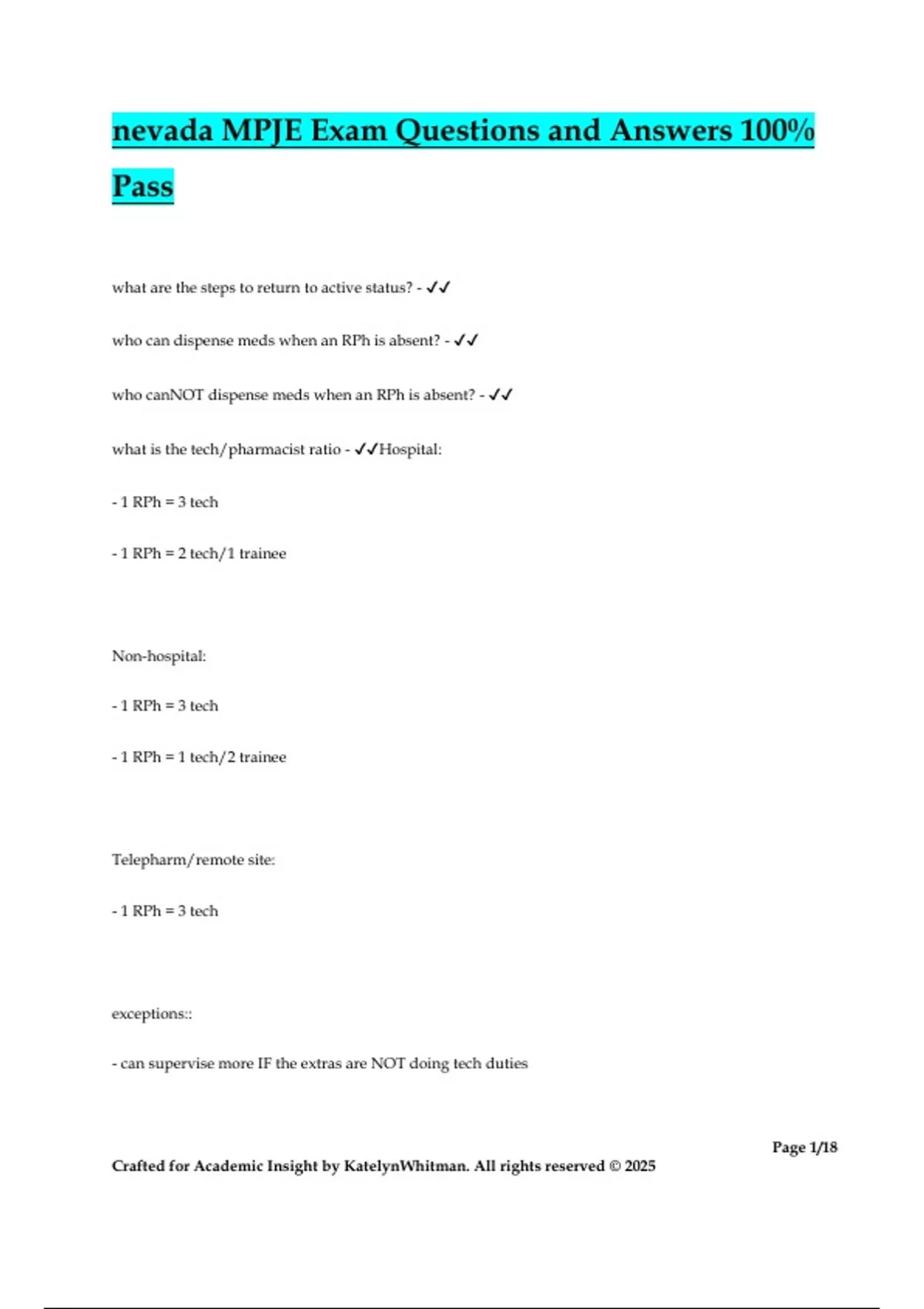 nevada MPJE Exam Questions and Answers 100% Pass what are the steps to return to active status? - who can dispense meds when an RPh is absent? - who canNOT dispense meds when an RPh is absent? - what is the tech/pharmacist ratio - Hospital: - 1 RPh = 3 tech - 1 RPh = 2 tech/1 trainee Non-hospital: - 1 RPh = 3 tech - 1 RPh = 1 tech/2 trainee Telepharm/remote site: - 1 RPh = 3 tech exceptions:: - can supervise more IF the extras are NOT doing tech duties Page 2/18 Crafted for Academic Insight by KatelynWhitman. All rights reserved © 2025 - must record who is/is not doing tech duties describe compounding for doctors - describe prescribing rights for pharmacists - how are DEA #s done? - describe transfers for in-network pharmacies - what are requirements for documenting patient counseling? - what are documentation/surrendering document requirements during an investigation? (fed and state) - what are controlled drug imprints on stock bottles? (sp. federal) - major amendments - controlled drug licensing/expirtion - duties of PIC - If a controlled substance is discontinued, expires,