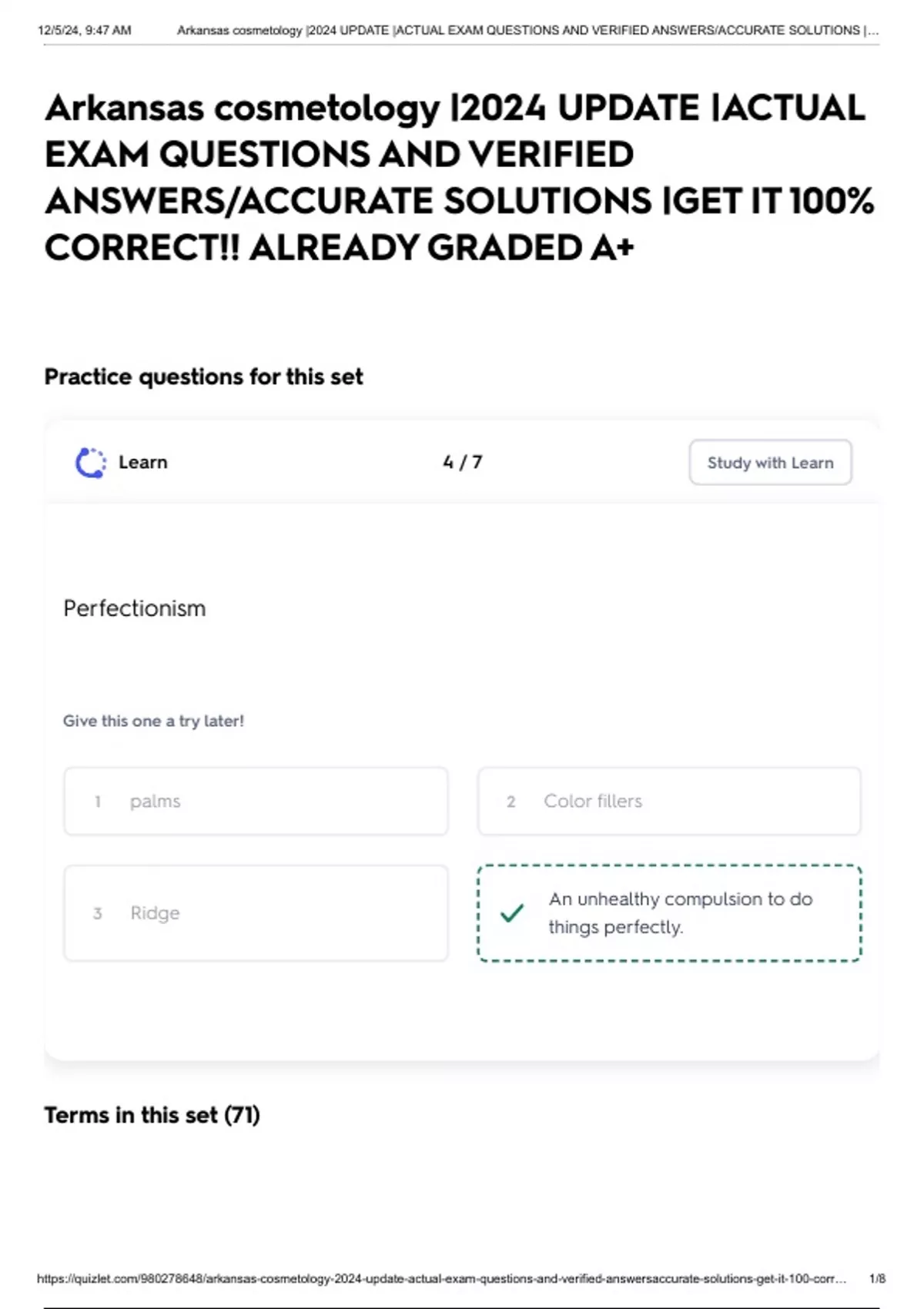 https://quizlet.com/980278648/arkansas-cosmetology-2024-update-actual-exam-questions-and-verified-answersaccurate-solutions-get-it-100-corr… 1/8
