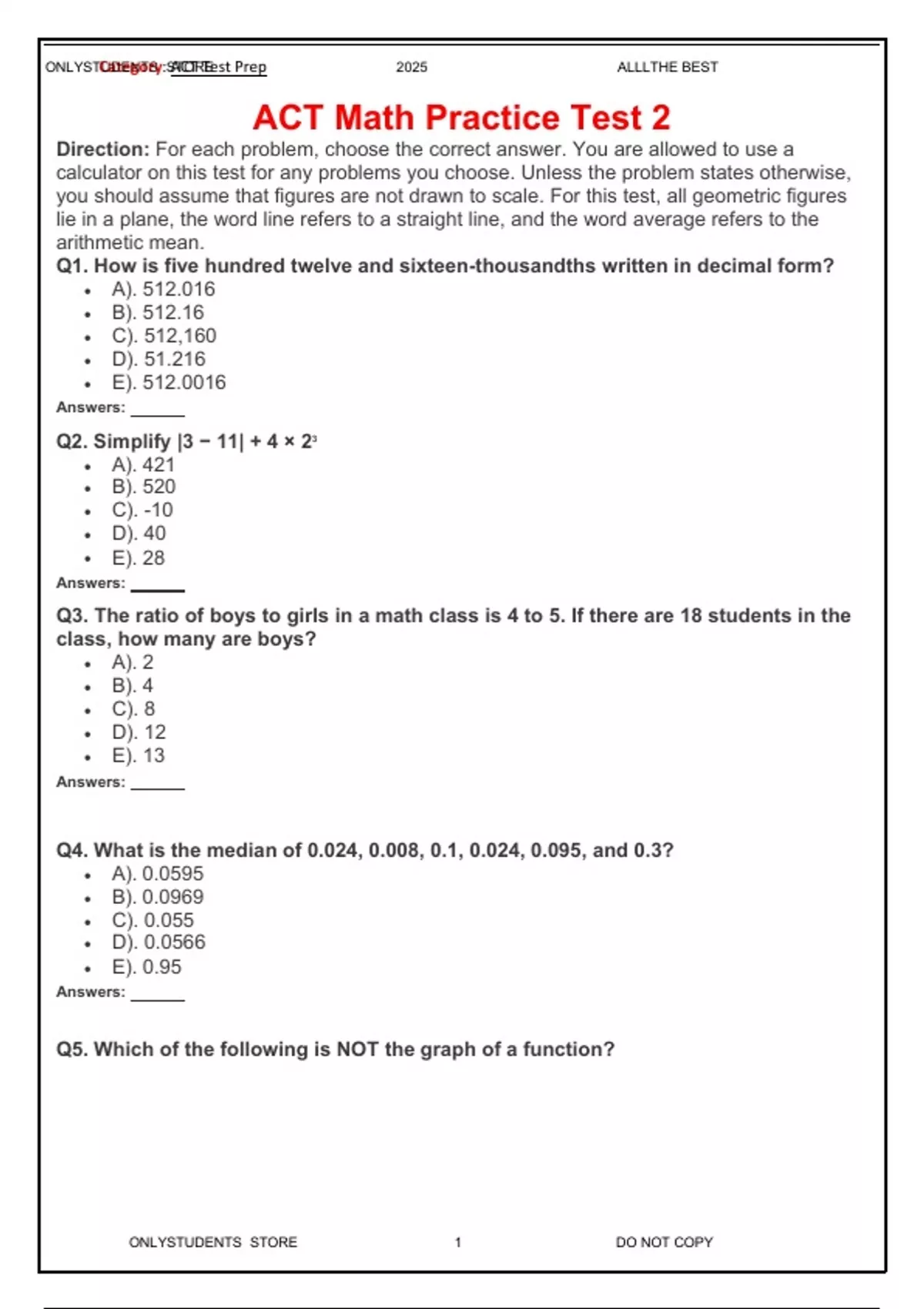 Direction: For each problem, choose the correct answer. You are allowedtouseacalculator on this test for any problems you choose. Unless the problemstatesotherwise,you should assume that figures are not drawn to scale. For this test, all geometricfigureslie in a plane, the word line refers to a straight line, and the word average referstothearithmetic mean. Q1. How is five hundred twelve and sixteen-thousandths written indecimal form? A). 512.016  B). 512.16  C). 512,160  D). 51.216  E). 512.0016 Answers: Q2. Simplify |3 − 11| + 4 × 23  A). 421  B). 520  C). -10  D). 40  E). 28 Answers: Q3. The ratio of boys to girls in a math class is 4 to 5. If there are 18 studentsintheclass, how many are boys?  A). 2  B). 4  C). 8  D). 12  E). 13 Answers: Q4. What is the median of 0.024, 0.008, 0.1, 0.024, 0.095, and 0.3?  A). 0.0595  B). 0.0969  C). 0.055  D). 0.0566  E). 0.95 Answers: Q5. Which of the following is NOT the graph of a function? ONLYSTCUaDtEeNgoTrSy:SATCOTRTEest Prep 2025 ALLLTHE BEST ONLYSTUDENTS STORE 2 DO NOT COPY Answers: Q6. What is the value of x5 for x = –3?  A). –243  B). 243  C). –43  D). 43  E). 13 Answers: Q7. What is the next number in the following pattern? 0, 3, 8, 15, 24, . . .  A). 34  B). 35  C). 36  D). 37  E). 33 Answers: Q8. What is the prime factorization of 84?  A). 42 × 2  B). 7 × 2 × 3  C). 22 × 3 × 7 ONLYSTCUaDtEeNgoTrSy:SATCOTRTEest Prep 2025 ALLLTHE BEST ONLYSTUDENTS STORE 3 DO NOT COPY  D). 22 × 6 × 7  E). 23 × 7 Answers: Q9. Find the slope of the line 7x = 3y − 9.  A). 3  B). −9  C). 3/7  D). −3  E). 7/3 Answers: Q10. The perimeter of a rectangle is 20 cm. If the width is 4 cm, findthelengthoftherectangle.  A). 5 cm  B). 6 cm  C). 15 cm  D). 25 cm  E). 32 cm Answers: Q11. Find the area of the following figure  A). 58 sq. in.  B). 18 sq. in.  C). 51 sq. in.  D). 39 sq. in.  E). 98 sq. in. Answers: Q12. Five cans of tomatoes cost $6.50. At this rate, how much will ninecansoftomatoes cost?  A). $13.00  B). $11.70  C). $3.30  D). $4.70  E). $13.70 Category: ACT Test Prep Subject: ACTMathAnswers: For more Question Answers Visit: 4 | P a g e Answers: Q14. Which inequality best represents the following graph?  A). −1.5 x −1  B). x ≤ 0  C). −0.5 x 0  D). −1.5 x ≤ 0  E). −1.5 ≤ x ≤ 0 Answers: Q15. Simplify −(6x4y3) 2  A). −36x 6y 5  B). −36x 8y 6  C). 366x 22y  D). −36xy  E). −36x 2y Answers: Q16. If 2x + 3y = 55 and 4x = y + 47, find x − y  A). 6  B). 12  C). 24  D). 28  E). 32